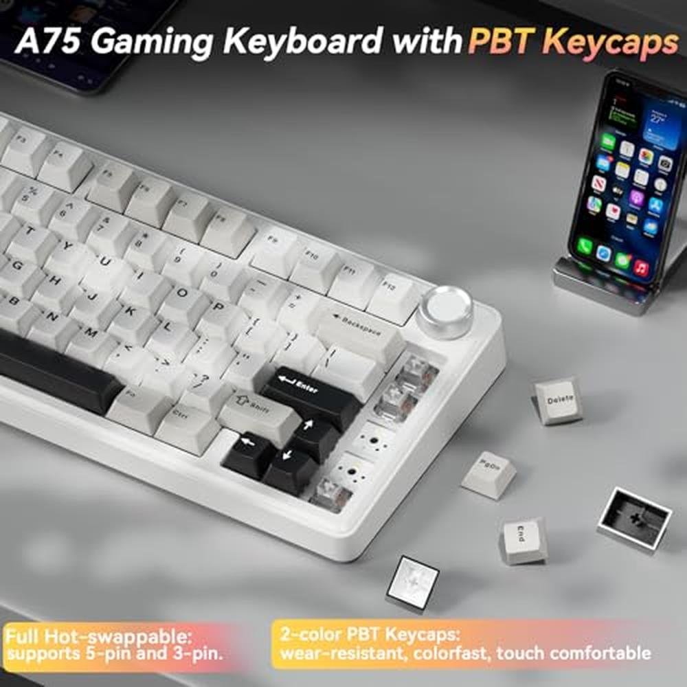 - The SOLAKAKA A75 features a hot swappable design, allowing for effortless customization and upgrading of switches, with a compact layout and durable PBT keycaps
