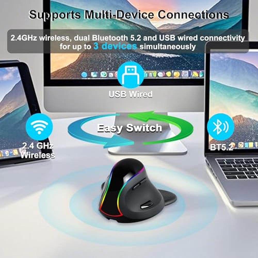 - Tri-moda Connection - Our ergonomic vertical mouse features a unique tri-mode connection technology that allows you to connect your device wirelessly via 2.4GHz, Bluetooth BT1/BT2, and wired via USB, providing a fast and stable connection over distances of up to 10 meters/33 feet.