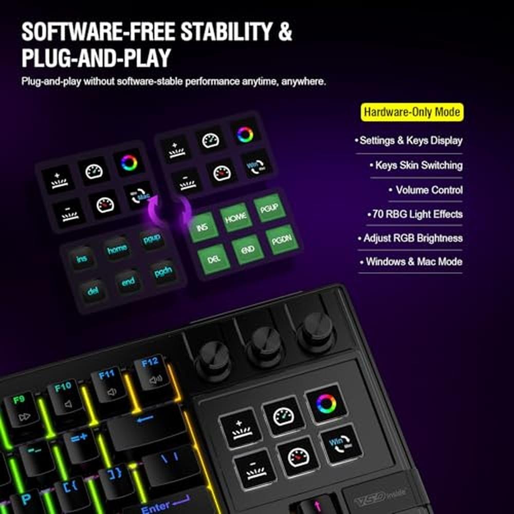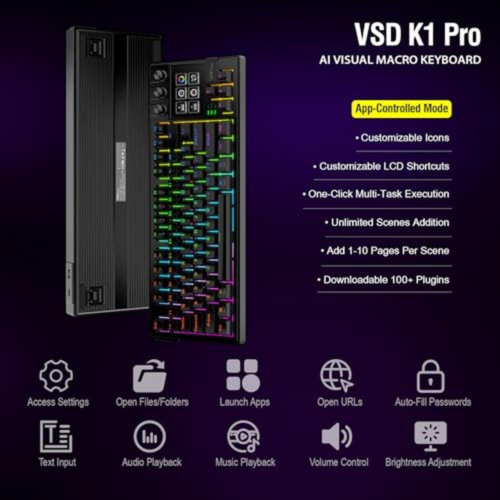 Experience the pinnacle of customization and control with the VSD K1 Pro, your all-in-one mechanical keyboard for gaming, streaming, and productivity. Designed for users who demand speed, personalization, and hassle-free performance, this keyboard is a game-changer for work and play. Core customization that saves time is at your fingertips, with the ability to customize every key, LCD icon, and knob function through an intuitive web portal. Swap in custom GIFs, assign multi-step macros, or map shortcuts for your favorite apps - all without coding. The 6 LCD keys and dedicated knob let you execute tasks in one tap, whether you're launching games, adjusting volume, or opening work docs. Premium typing feel is ensured with a gasket mount structure, reducing vibration for a smooth, shake-free typing experience perfect for late-night gaming sessions or back-to-back meetings. Pre-lubricated Linear Red Switches offer a quiet, responsive feel, while the hot-swappable design lets you swap switches in minutes (tool included) to match your style. Sound-dampening foam layers eliminate rattle, delivering that satisfying thock sound gamers and typists crave. Plug-and-play convenience is guaranteed, with no downloads or hassle required - simply plug in the anti-static USB cable and start using it instantly. Hardware-only mode gives you quick access to RGB controls, volume adjustment, and OS switching (Windows/Mac), while app-controlled mode unlocks unlimited scenes and 100+ downloadable plugins. Style meets comfort with 70+ RGB light effects, adding flair to any desk setup - whether you're into minimalist aesthetics or bold gaming vibes. The ergonomic design features concave keycaps to reduce finger strain and adjustable stands (3-6.13) for personalized comfort. Non-slip silicone feet keep it steady, even during intense gaming marathons. Built to last with a 50-million-keystroke lifespan, the VSD K1 Pro is compatible with all your devices and ready to elevate your workflow. Whether you're a streamer, content creator, or remote worker, this keyboard blends performance, customization, and durability - all in one sleek package.