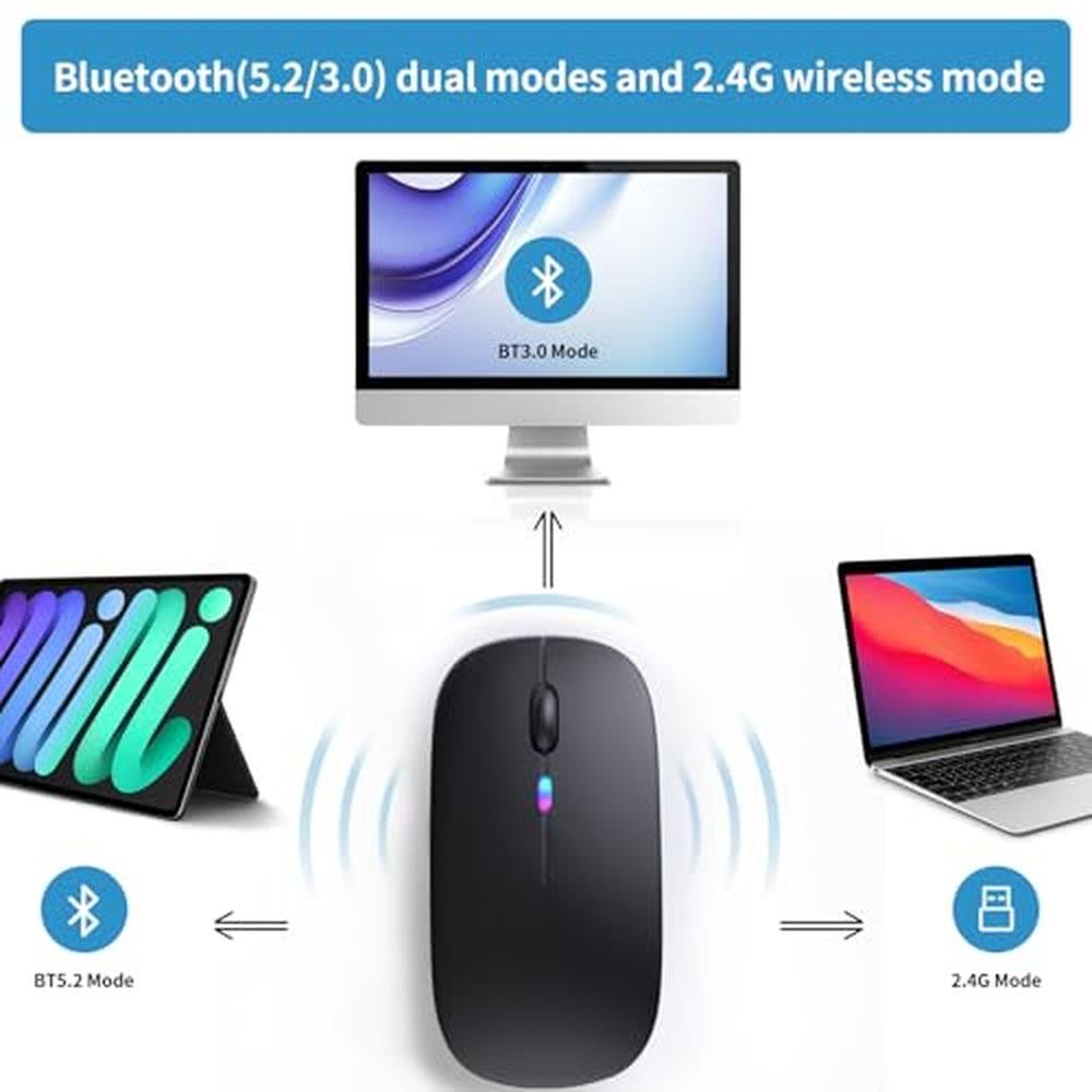 - Dual Mode Wireless Bluetooth Mouse: Switch easily between two devicesconnect one via Bluetooth (BT5.2/3.0) and the other using a 2.4G USB receiver. No drivers needed; just plug and play. Enjoy a reliable connection up to 33 feet. Note: You can't use both modes simultaneously; the USB receiver is stored in the mouse.