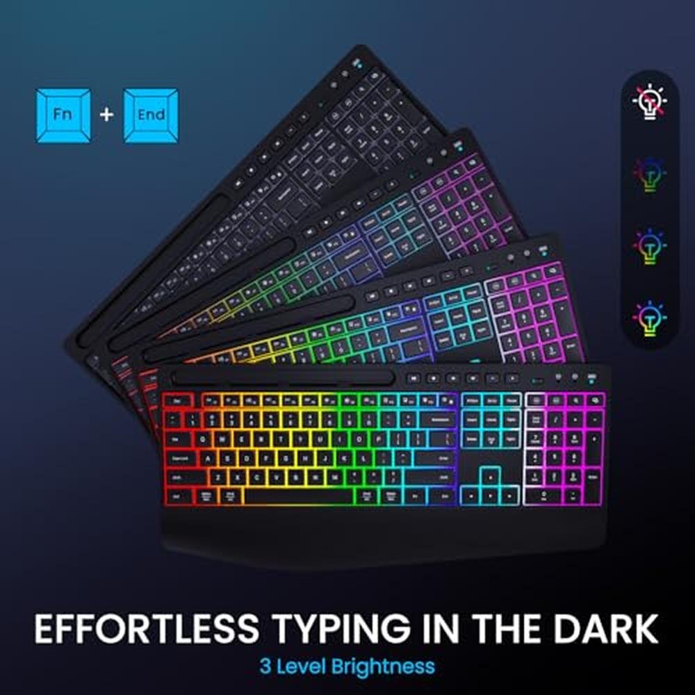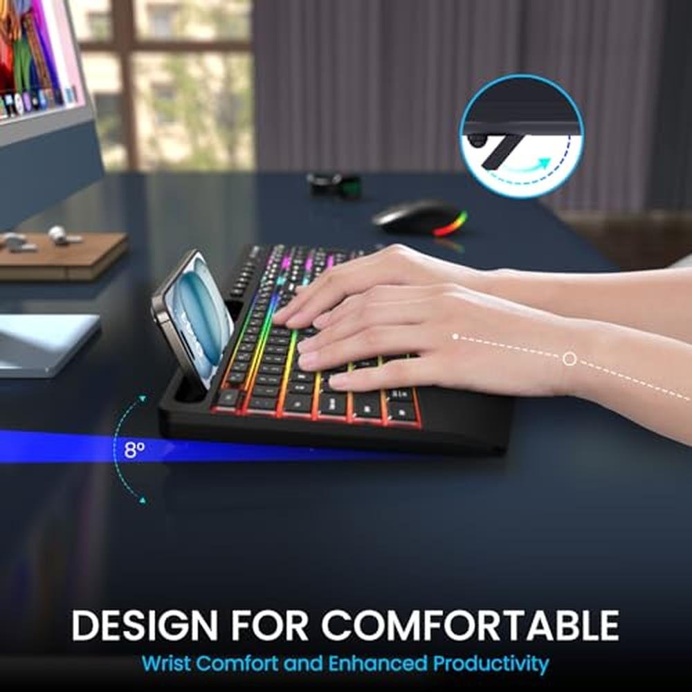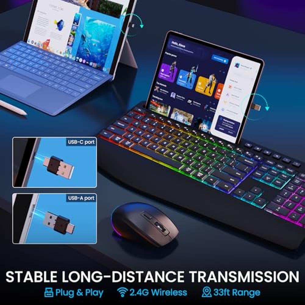 Wireless Keyboard Mouse Combo | Dual System RGB Backlit Ergonomic Silent Design | 2.4G Rechargeable Full Sized Keyboard and Mouse Set for Windows Mac PC Laptop