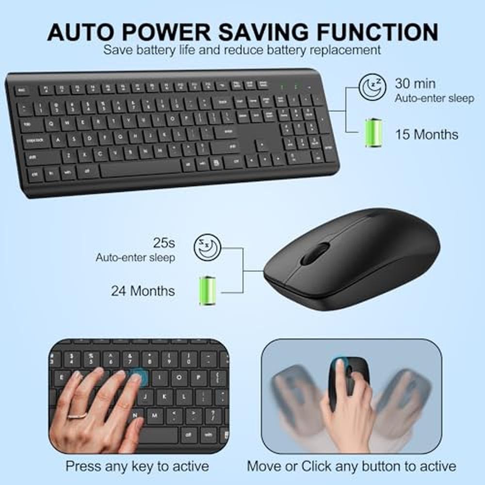 Indulge in the ultimate typing and navigation experience with our premium wireless keyboard and mouse combo, expertly designed to provide seamless interaction with your computer, Mac, laptop, or PC. As a top-tier keyboard mouse combo, our full-size silent ergonomic keyboard and optical mouse combo boasts a lag-free 2.4G cordless connection and extended battery life, making it perfect for daily use. Whether you're seeking a high-end wireless keyboard mouse combo or a reliable keyboard mouse set, our 2-pack combo is an excellent choice, offering exceptional value at an affordable price. With its sophisticated design and advanced features, this wireless keyboard and mouse combo is ideal for those who demand superior performance and comfort. Experience the freedom of wireless connectivity and elevate your productivity with our premium wireless keyboard and mouse combo.