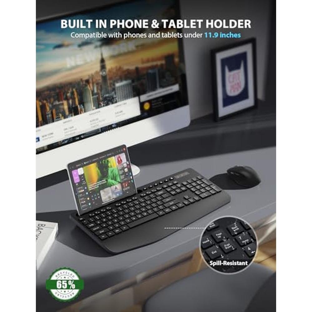 - The Trueque Wireless Keyboard and Mouse Combo features a full-sized ergonomic keyboard with a built-in wrist rest and phone holder, reducing strain and facilitating effortless multitasking.