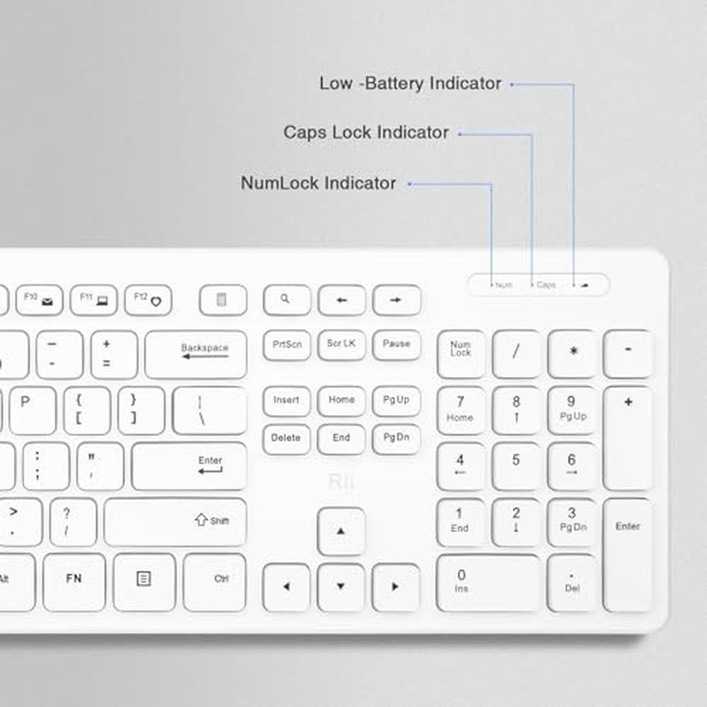 Wireless Keyboard Mouse Combo | Rii Standard Office PC Keyboard and Optical Wireless Mice White | Long-Lasting Battery Life