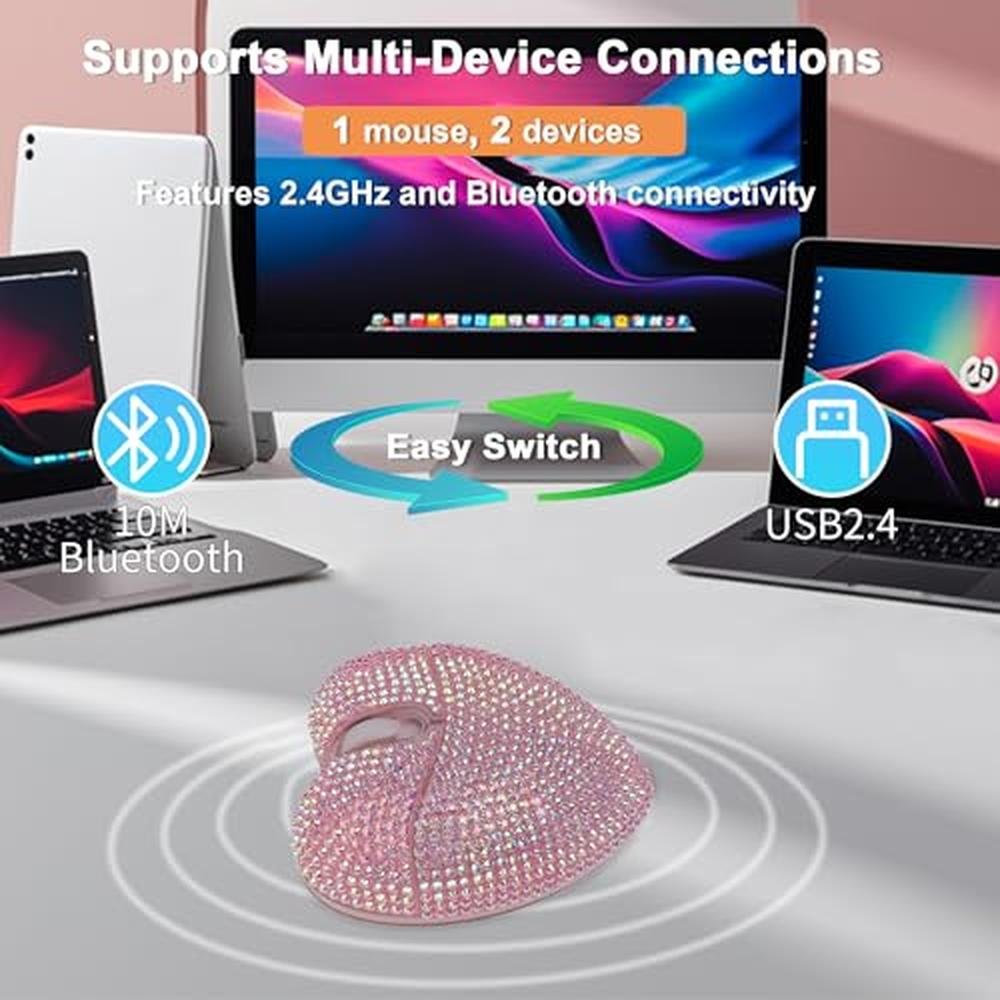 Experience the perfect blend of style and functionality with our premium Bluetooth mouse, featuring a unique heart shape design and diamond-encrusted details. This rechargeable USB cordless mouse offers dual mode connectivity via 2.4GHz and Bluetooth, making it compatible with a wide range of devices, including laptops, PCs, and desktops. With a high-precision 1000DPI optical sensor and LED light, you'll enjoy smooth and accurate navigation. Whether you're working or gaming, this cute and bling diamond-encrusted mouse is the perfect accessory for your computing needs.