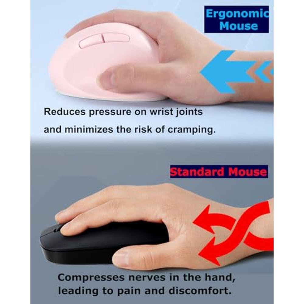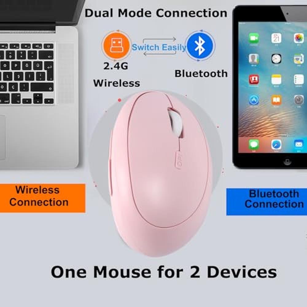 Discover the ultimate wireless mouse experience with our premium ergonomic pink Bluetooth and USB mice, designed for comfort and versatility. Suitable for Mac, PC, laptop, computer, tablet, iPad, MacBook Air, and Pro, our dual-mode vertical silent portable multi-device mice cater to the needs of office workers and women on-the-go. Our ergonomic design reduces strain on your hands and wrists, preventing carpal tunnel syndrome. With a sleek and compact design, this wireless mouse is perfect for travel and office use.