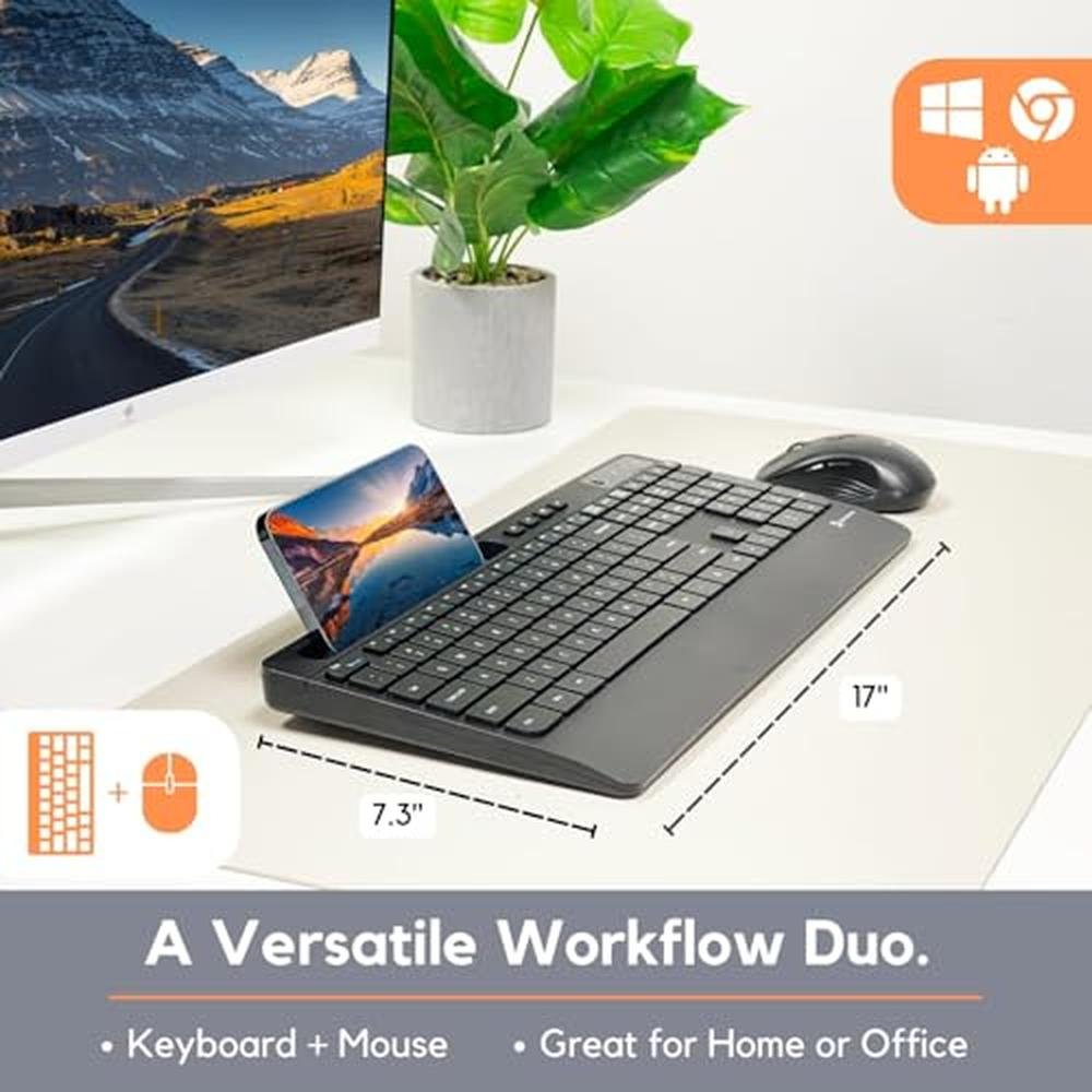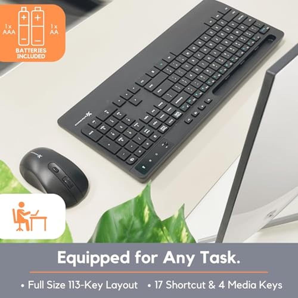 Unlock your full potential with the X9RACDOCKCB Wireless Keyboard and Mouse Combo, a game-changing wireless keyboard and mouse combo designed for effortless productivity. Compatible with PC, Android, and Chrome devices, this combo streamlines your workflow, offering an exceptional typing and navigation experience. With its unique dual RF dongle, you can enjoy the freedom of 2.4GHz wireless connectivity, perfect for any workspace. The integrated 8-inch device slot on the keyboard accommodates your tablet or smartphone, making multitasking easy and keeping you connected while you work.