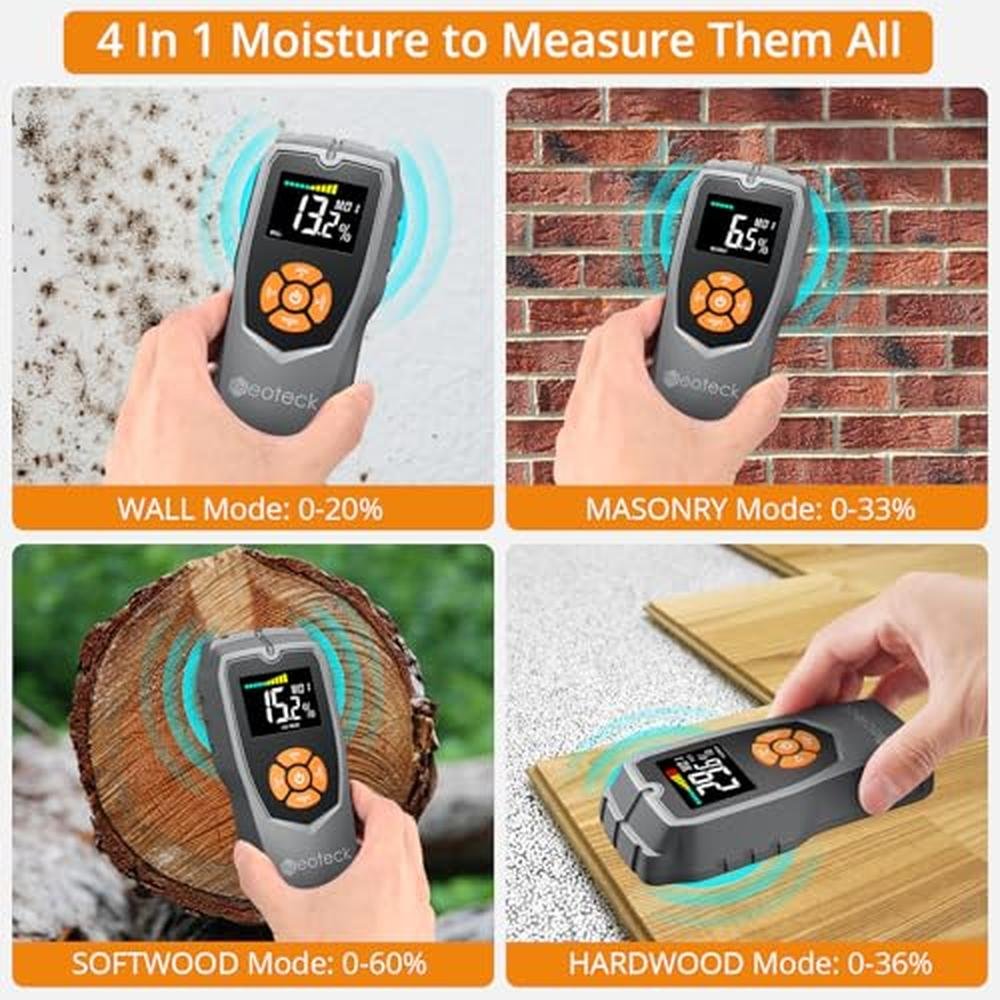 - Visual and Audible Alerts4 modes of SOFTWOOD/ HARDWOOD/ WALL/ MASONRY are in this pinless moisture sensor, meeting multiple scene applications. This firewood moisture detector features a large LCD color display with a colored analog display bar, making visualization of measurement results easier to understand. This moisture meter for lumber will automatically alarm and quickly display the readings to help identify the moisture when the wood moisture reaches the set value.