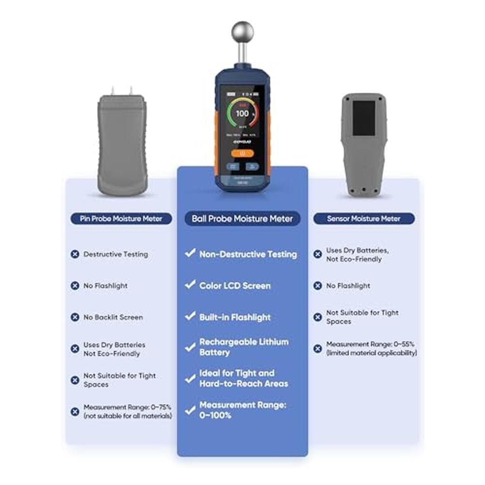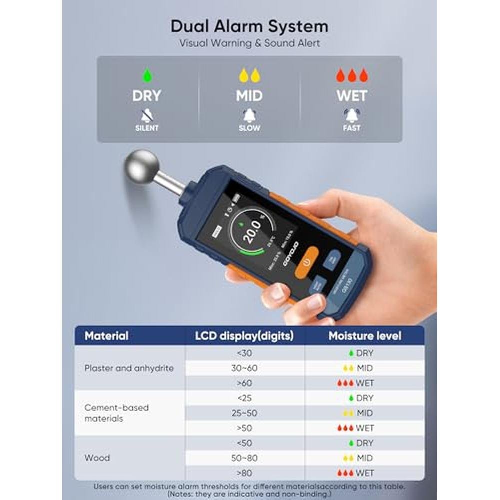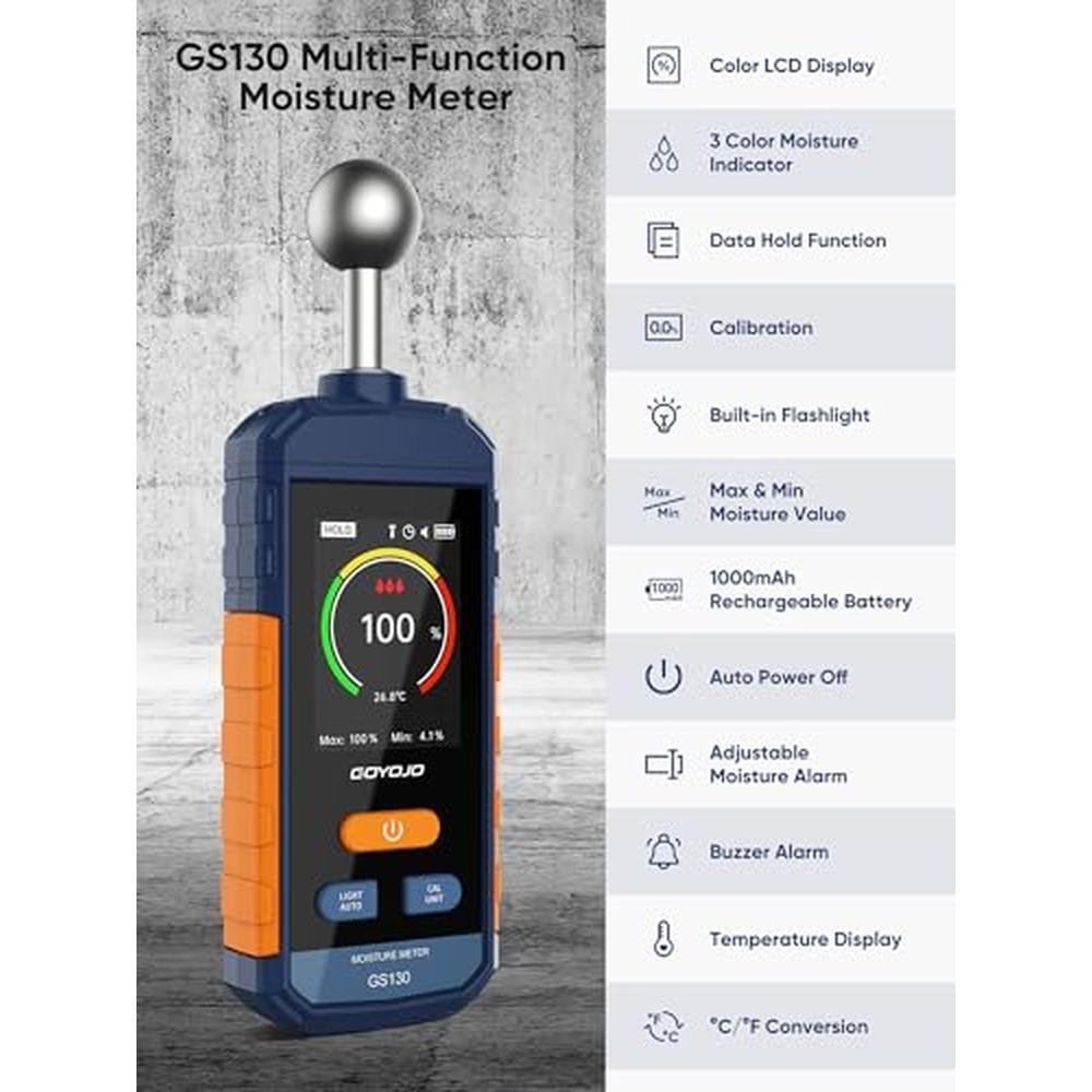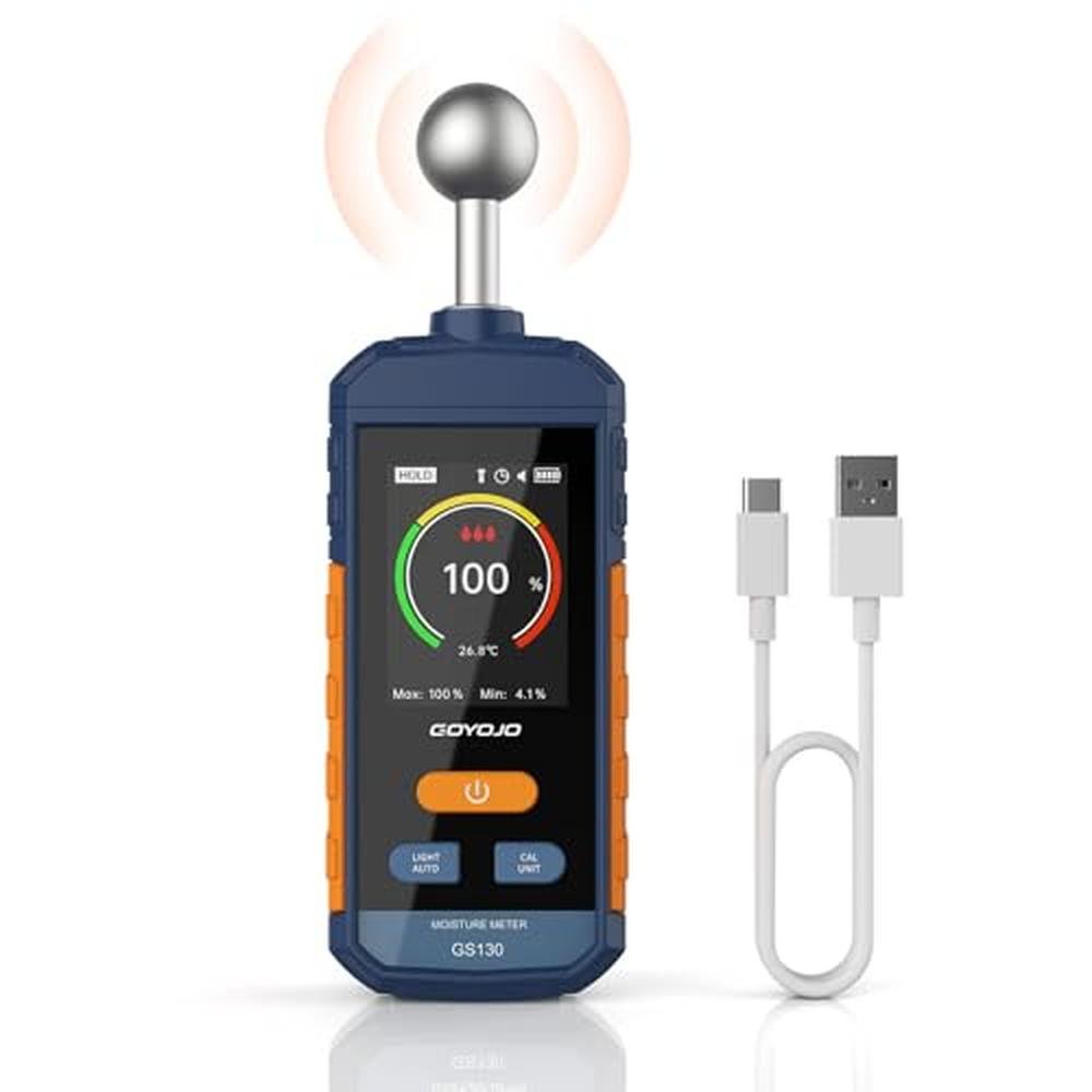 Excess moisture can compromise material quality, cause long-term surface damage, and delay your projects. The GOYOJO GS130 gives you fast, non-destructive readingsso you can make confident decisions before problems start.This moisture meter pinless device uses a high-sensitivity spherical sensor to scan moisture up to 40mm deep, without piercing or scratching the surfaceideal for wood, drywall, flooring, and other non-metallic materials. Results appear in just 3 S with 2.5% accuracy, reducing work interruptions and boosting on-site efficiency.Technical features:- Measurement Range: 0100%- Accuracy: 2.5%- Depth Detection: 5~40mm (material-dependent)- Response Time: ~3 S- Operating Temp: 040C (32104F)- Sensor Type: Capacitive pinless spherical designDisplay &interactive experience- LCD Color Display: Crisp, easy-to-read interface- Tri-Color Bar Graph: Visual moisture scale (Green = Dry, Yellow = Caution, Red = High)- Manual Alarm Setting: Set moisture thresholds with optional buzzer feedback- Battery Indicator: Low power warning on screenBattery life and portable design- Power Supply: Built-in rechargeable lithium battery- Charging: USB-C (cable included)- Auto Shut-Off: 15 minutes of inactivity- Design: Lightweight, spherical, fits comfortably in one handSuggestions and precautions for use- Not suitable for metal surfacesmetal or nearby conductive objects may affect readings- For best accuracy, hold the lower half of the device to avoid interference from hand moisturePerfect for:- Carpentry &wood drying-Drywall inspection &home maintenance- Flooring installation &renovation-Furniture factories, warehouses, or on-site assessmentsWhether you're a contractor or DIYer, the GS130 is a reliable wood detector, drywall moisture detector, and a top choice for home moisture detection, ensuring material protection &project success.