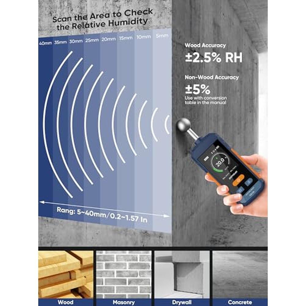 - NON-INVASIVE & NO SURFACE DAMAGE - Moisture meter for drywall uses pinless technology to detect moisture up to 40mm deepno punctures needed. Great for finished surfaces, drywall, firewood, and structural wood inspections