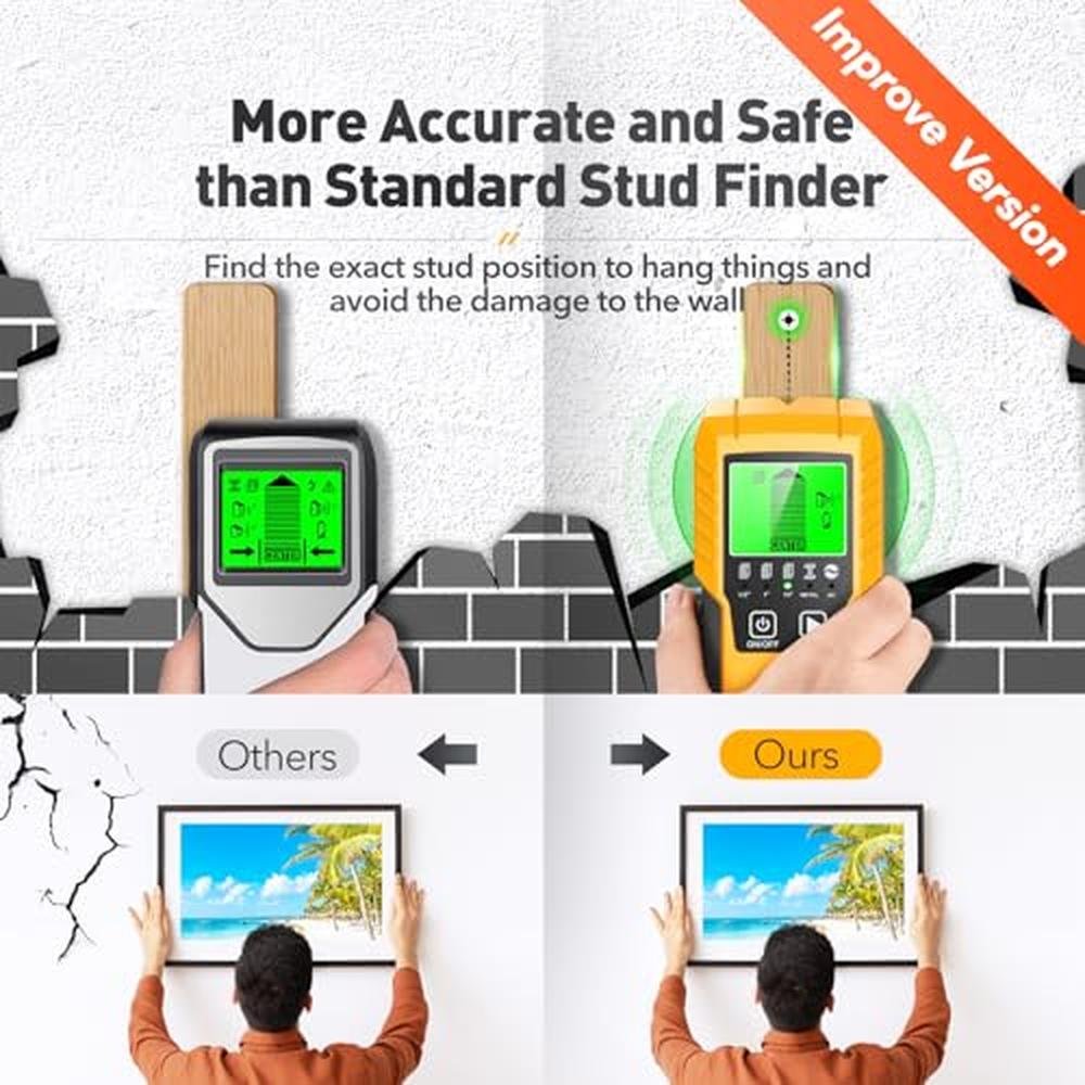Experience the ultimate stud wall scanning solution with our 5-in-1 Electronic Wall Scanner Detector, designed to simplify construction, renovation, or DIY projects by locating stud wall framing, including wood and metal studs, joists, and lumber. With advanced edge and center sensor technology, you can easily detect live AC wires, pipes, and other objects behind drywall, ensuring safe and accurate drilling. Whether you're a professional contractor or a homeowner, our stud wall finder is the perfect companion for any project, providing precise measurements and saving you time and effort. Say goodbye to guesswork and hello to efficient stud detection. If you're hanging heavy pictures, mirrors, or shelves, you need to know where your wall studs are, because attaching anything heavy to drywall itself could eventually lead to the item crashing to the floor. Our Povlen stud finder can help eliminate some of the frustration and repainting that comes from less modern methods. Which stud finder is best? Are electronic models better than the magnet ones? Answers aren't the same, but some were clearly better than others. Povlen electronic stud finders are more precise at locating studs than magnetic ones. And if you want a stud finder that's accurate and easy to use, your favorite will be the Povlen stud finder's wall scanner. After investigating 25+ of the best stud finders on the market, we tested some models to compare with our Povlen stud finders. We tested them for accuracy, ease of use, and features both in isolated, objective tests, as well as while working on home projects. The results show that Povlen stud finder is a great pick and more accurate and consistent than 95% of stud finders on the market. You can use this Povlen wall stud finder to find wiring, pipes, metal, or wood as deep as 2 inches into drywall or plaster. The LCD and audio alert of this wall scanner let you know when you've identified the center of the stud and let you know if you're near a live wire you might want to avoid. The intuitive interface makes it a dream to operate, and as long as it's properly calibrated, there will be no accuracy issues with the Povlen wall scanner.