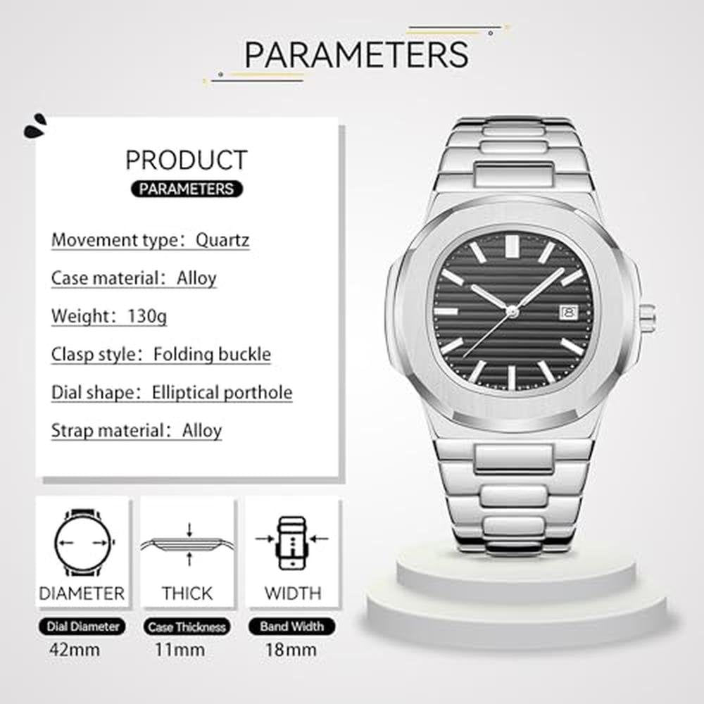 BARAMON Wrist Watches for Men, Nautilus Stainless Steel Quartz Movement Date Luxury Style Men's Luminous Hands Casual Business Watches