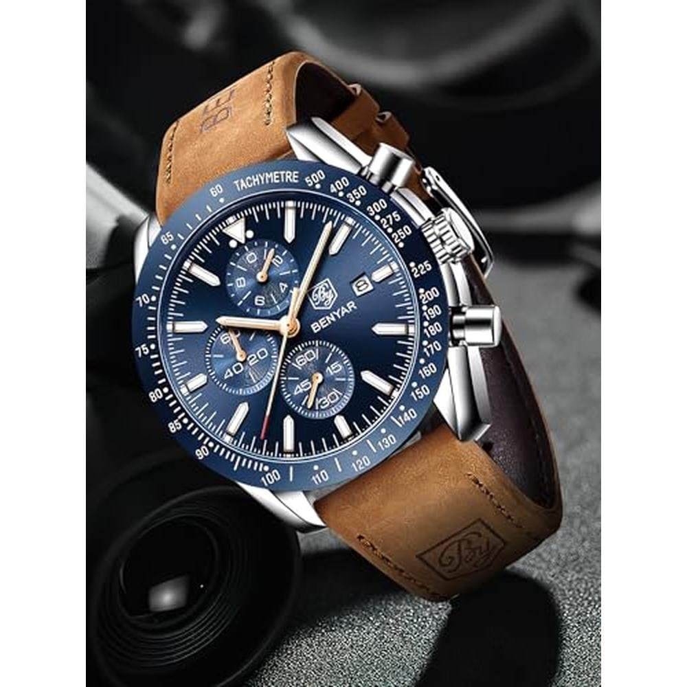 - UNIQUE ELEGANT DESIGNThis is a stylish and classic design man watch. 45MM beautiful and exquisite big face with three functional subdials and date display, tachymeter numerals on the bezel, with a fashion leather strap, Quality quartz analog movement and Long-life battery, provide precise time and perfectly match any of your outfits, Benyar analog wrist watch embodies the pursuit of fashion and quality that redefines time!