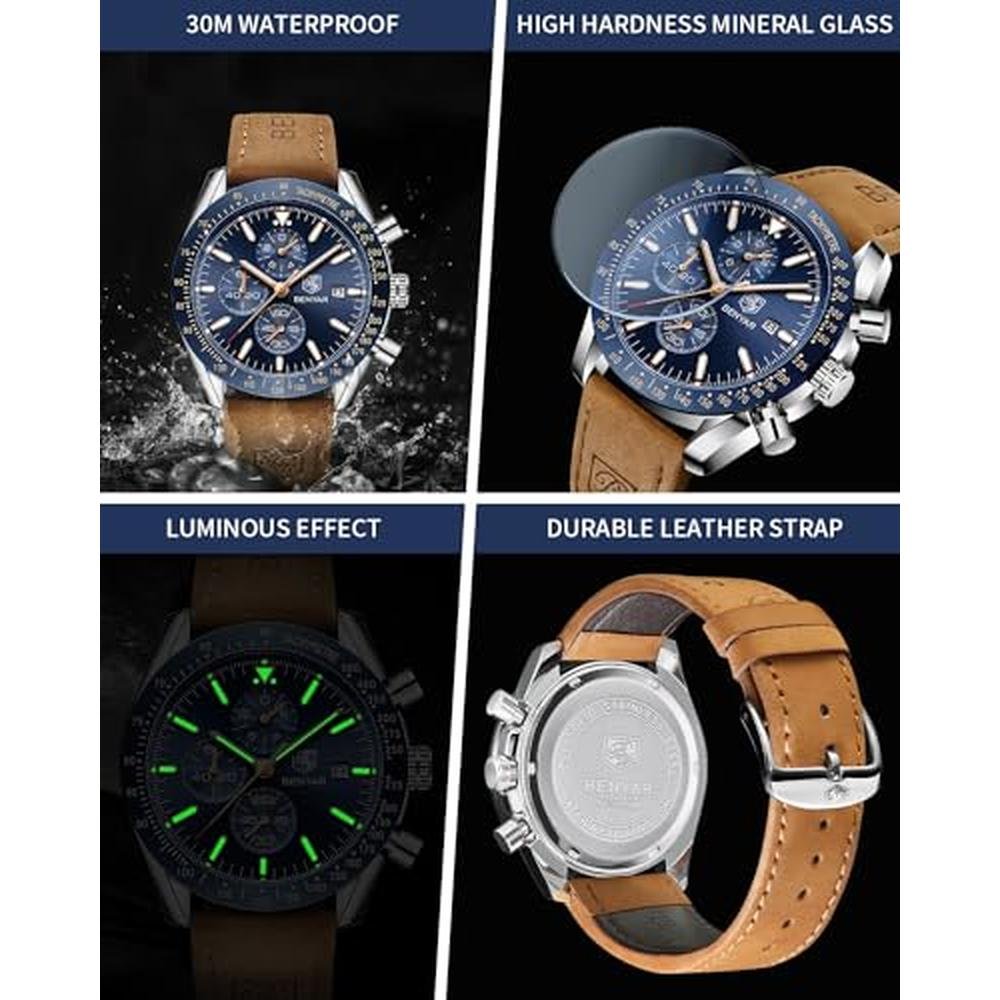 - WATERPROOF CHRONOGRAPH WATCH: Multifunctional sub-dial can be used as timers (1/10 Second, Second and Minute Chronographs). BENYAR's waterproof chronograph watches for men is waterproof 30M/3ATM, can withstand sweat, accidental rain or water splash (Showering, swimming, immersion in water is not recommended). After absorbing enough light energy to have a certain glow-in-the-dark effect in dark environments. It is a multifunctional leather watches for men.