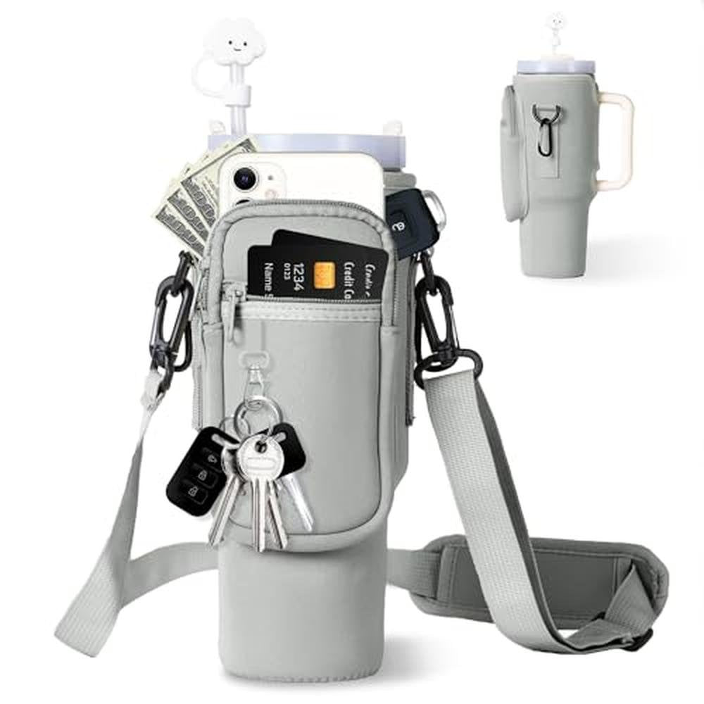 dabria Water Bottle Carrier Bag with Phone Pocket for Stanley 40/30 oz Tumbler Neoprene Water Bottle Holder Pouch with Adjustable Strap Bollus with Straw Cover & Carabiner for Stanley Cup Accessories