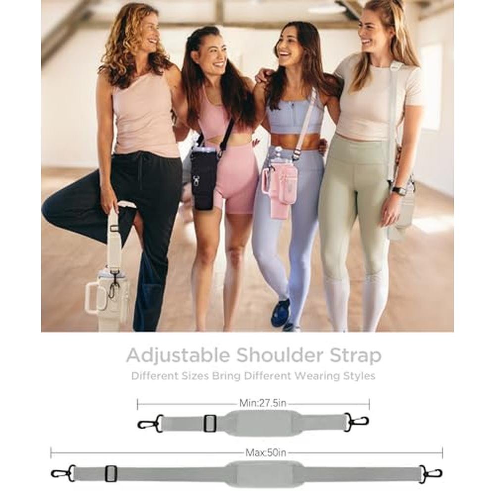- Adjustable Shoulder Strap and Multiple PocketsFor Stanley Quencher 40 oz Cup Sleeve comes with a removable and adjustable padded shoulder strap, the shoulder strap can be easily adjusted between 27.5" and 50" to fit a wide range of body shapes. The water bottle holder for stanley 40 oz tumbler is designed with two front pocket designs that provide plenty of room for all your personal belongings such as smartphones, cash, cards,keys,etc