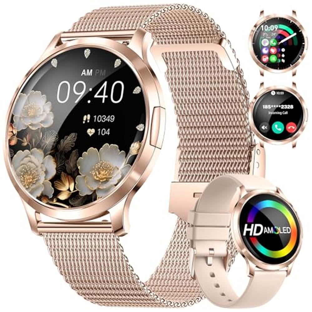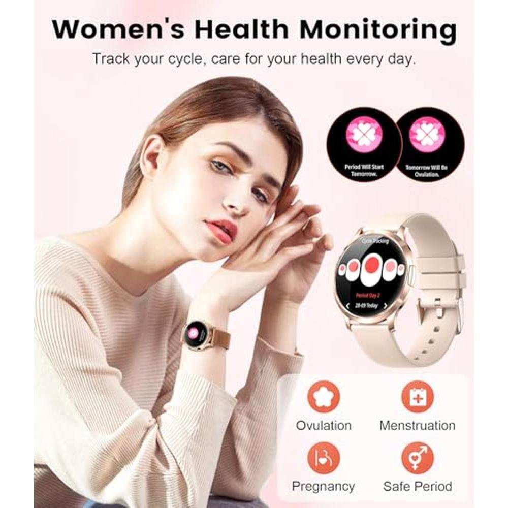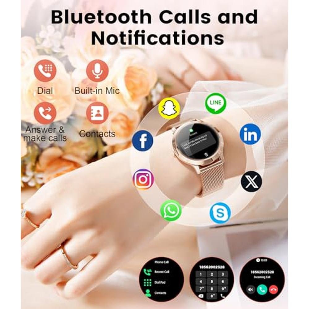 - Smartwatch for ladies with Call and AI Voice AssistanaceOne-touch calls and message notifications via Bluetooth 5.0 technology with built-in microphone and speaker for clear conversations. You can also save contacts and view call logs. The integrated voice assistant frees your hands and ensures a convenient and smart life.