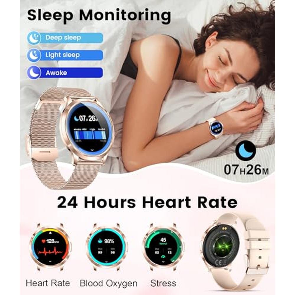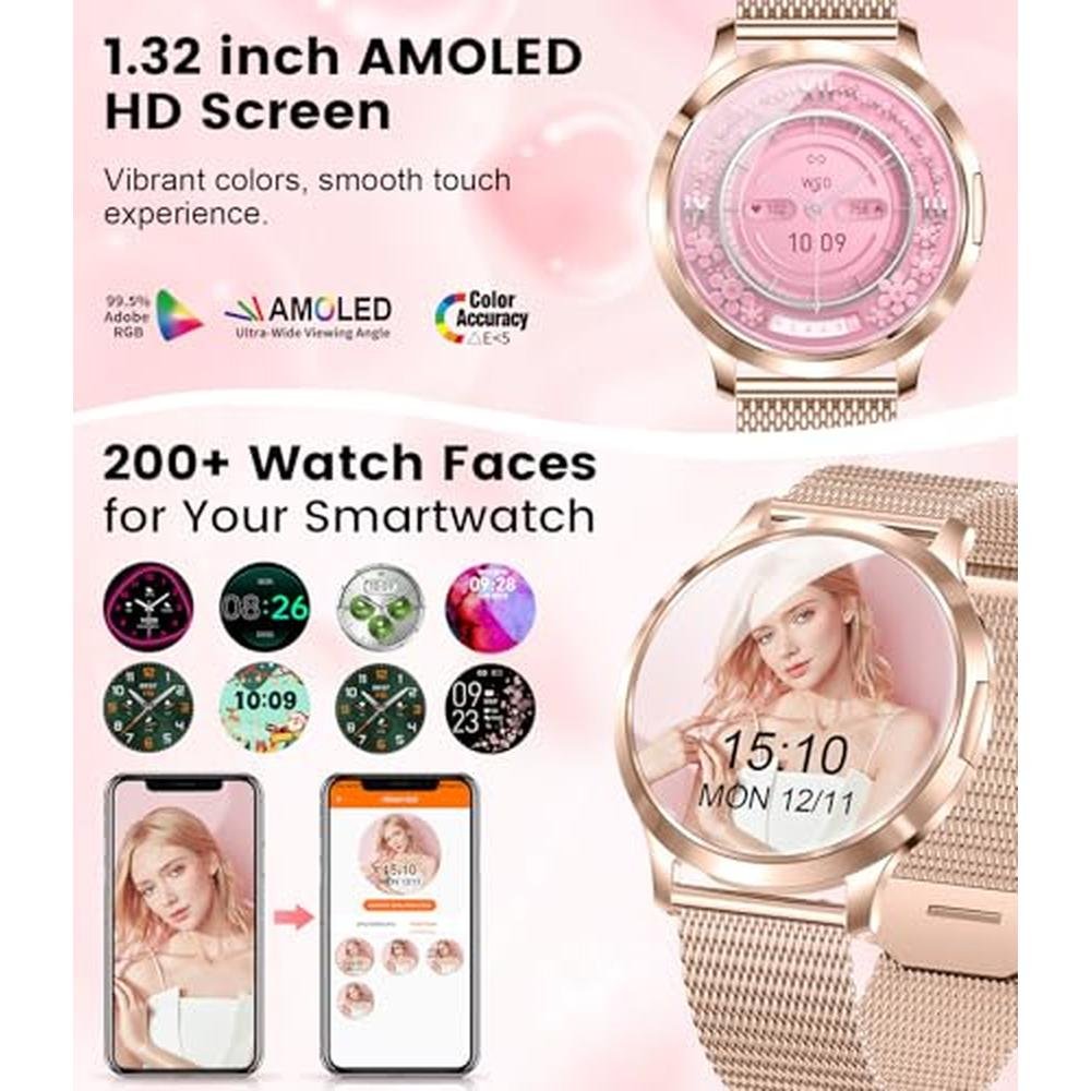 - An Exemplary New Work of Luxury and EleganceDREMAC 2025 smartwatch women features a unique rounded arc 1.32-inch AMOLED curved display with a full-time online display mode.The display with 466*466 pixels is more realistic and clearer. The ultra-thin body of 8.5mm and 43 grams makes you feel comfortable without feeling constricted. The new skin-friendly mesh strap and soft silicone strap are simple and stylish, so you can change the strap for different occasions.You can also show your photo on the watch with DIY dial to show your unique self.