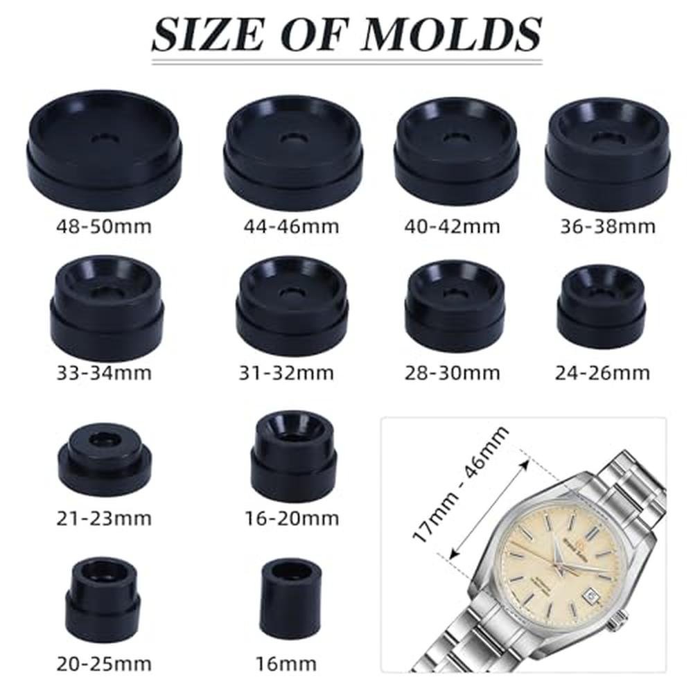 - Perfect set: We have prepared 12 black molds, a watch press, a prying pin and a lifting piece, as well as a cleaning towel in each packaging. By using these tools, you can fully meet multiple needs. This would be a good helper.