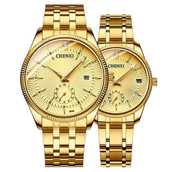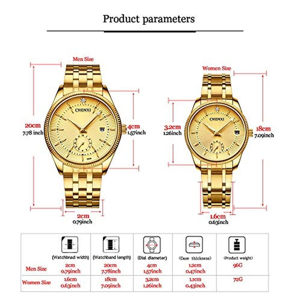 Watches categories;His & Hers Couple Watch style Luxury Movement type;Quartz Battery LifetimeMore than 3 years Shape of the dial:Round Display type:Analog Dial material:Alloy Dial window material:Hardlex Dial color:Black / white / gold Band materialStainless Steel Clasp typeFolding Clasp with Safety Band color; gold Men Size Watch Band Width: 2cm Watch Case Diameter: 4 cm Watch Case Thickness: 1.1 cm Women Size Watch Band Width:1.6cm Watch Case Diameter: 3cm Watch Case Thickness:0.8cm Life waterproof You can wash hands and face, rain, splash water with the watch. But it doesn't support bathing, swimming, diving. The watches use electroplate technology. Golden color is not only perfect, but also not easy to fade, and ensures durability. We are professional watch sellers, selling any kinds of watches for men/women. If you need any hlep about watches, a good choice to contact us. Purchasing watches form us is not only just a watch, but with good customer service and warranty. We have a well trained customers sevice team, which could reply you in short time and give you help, aim to give a better shopping experience to our customers.