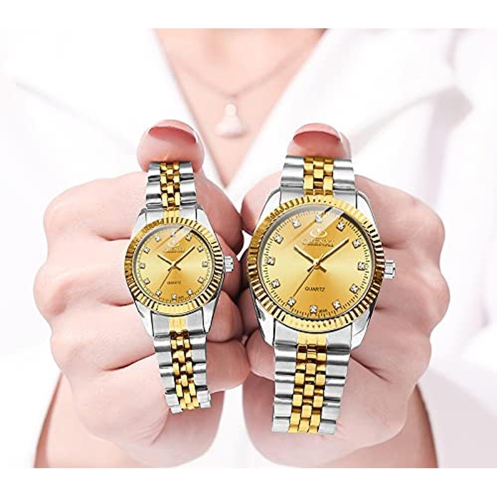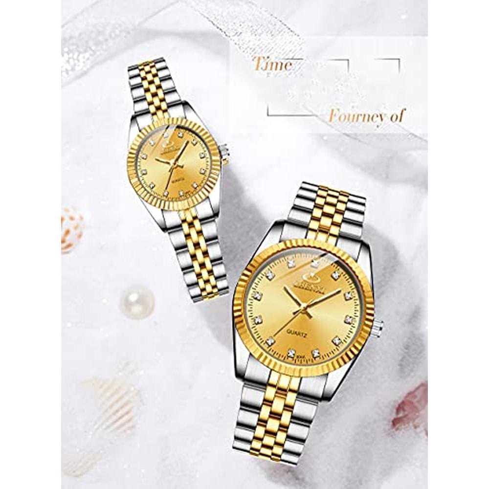 Swiss Brand Two Tone Watch Men Women Gold Silver Stainless Steel Waterproof Couple Watches (Gold)