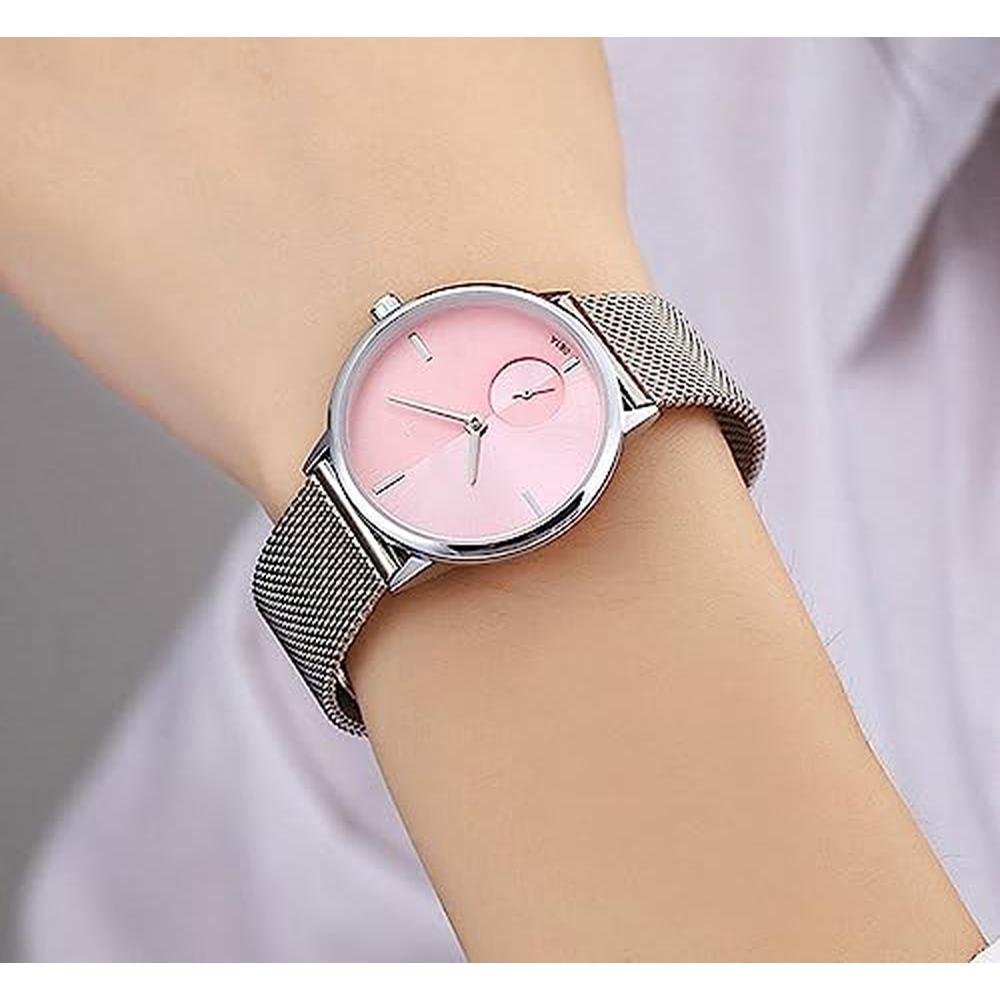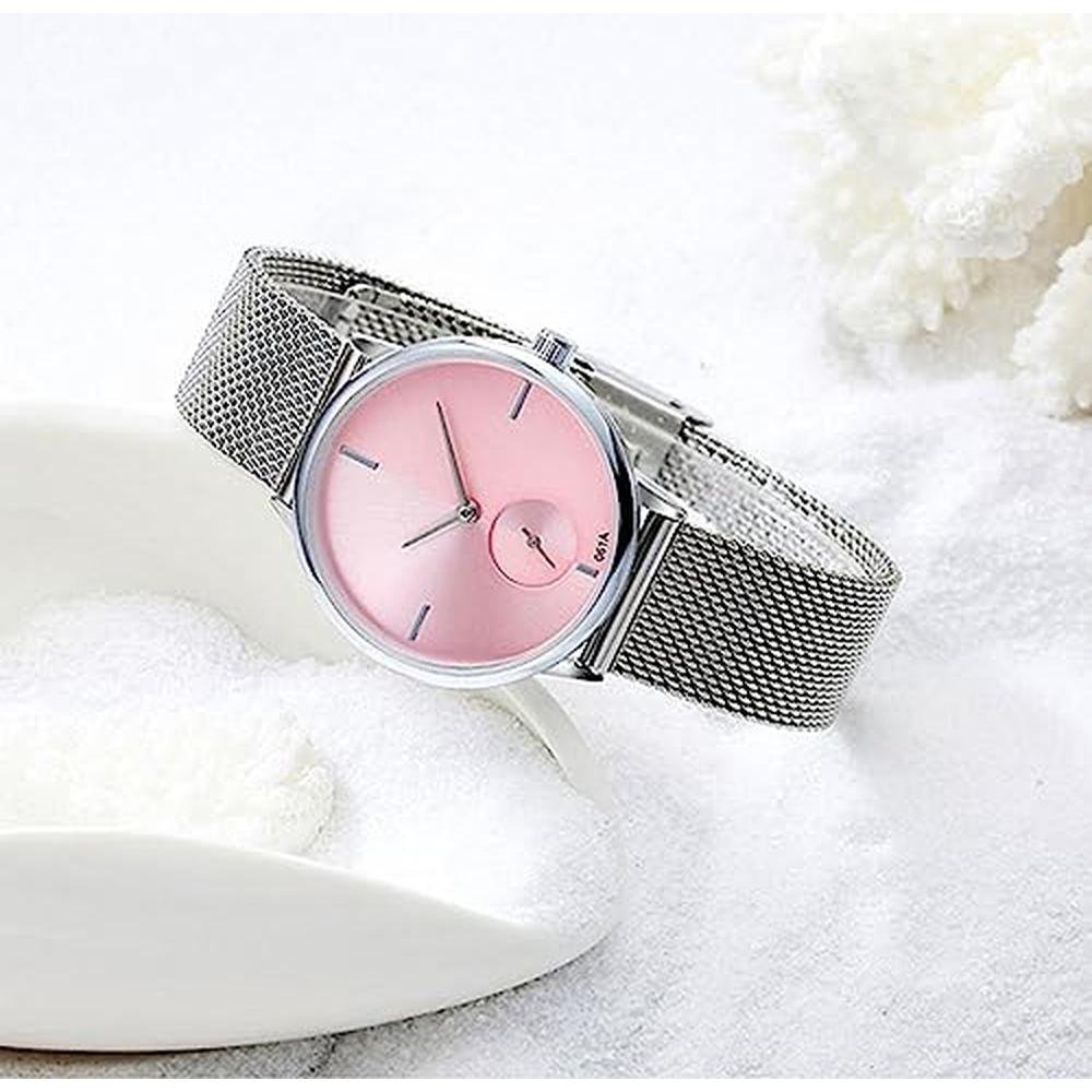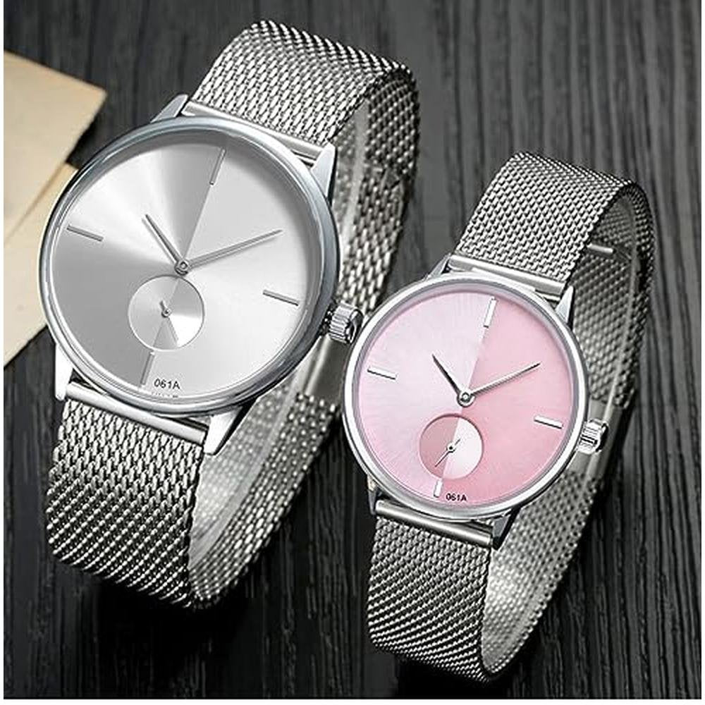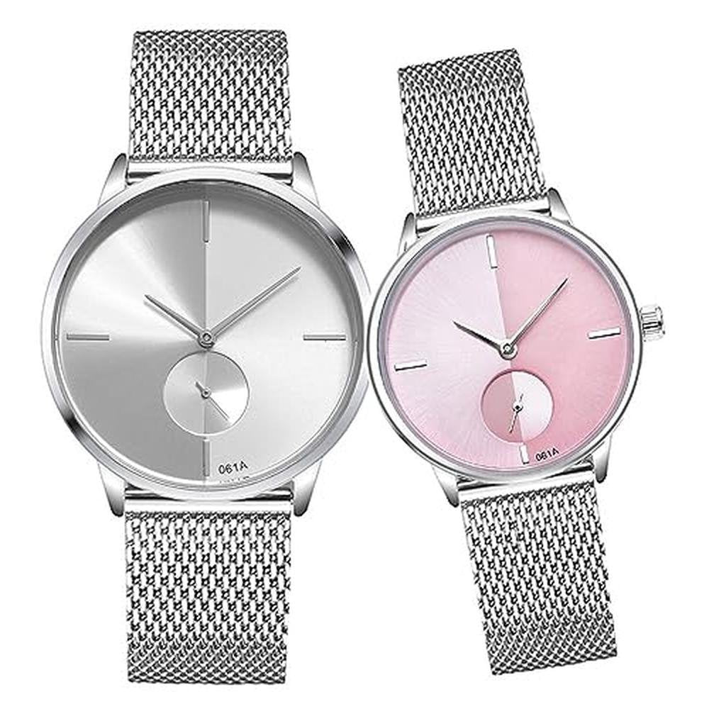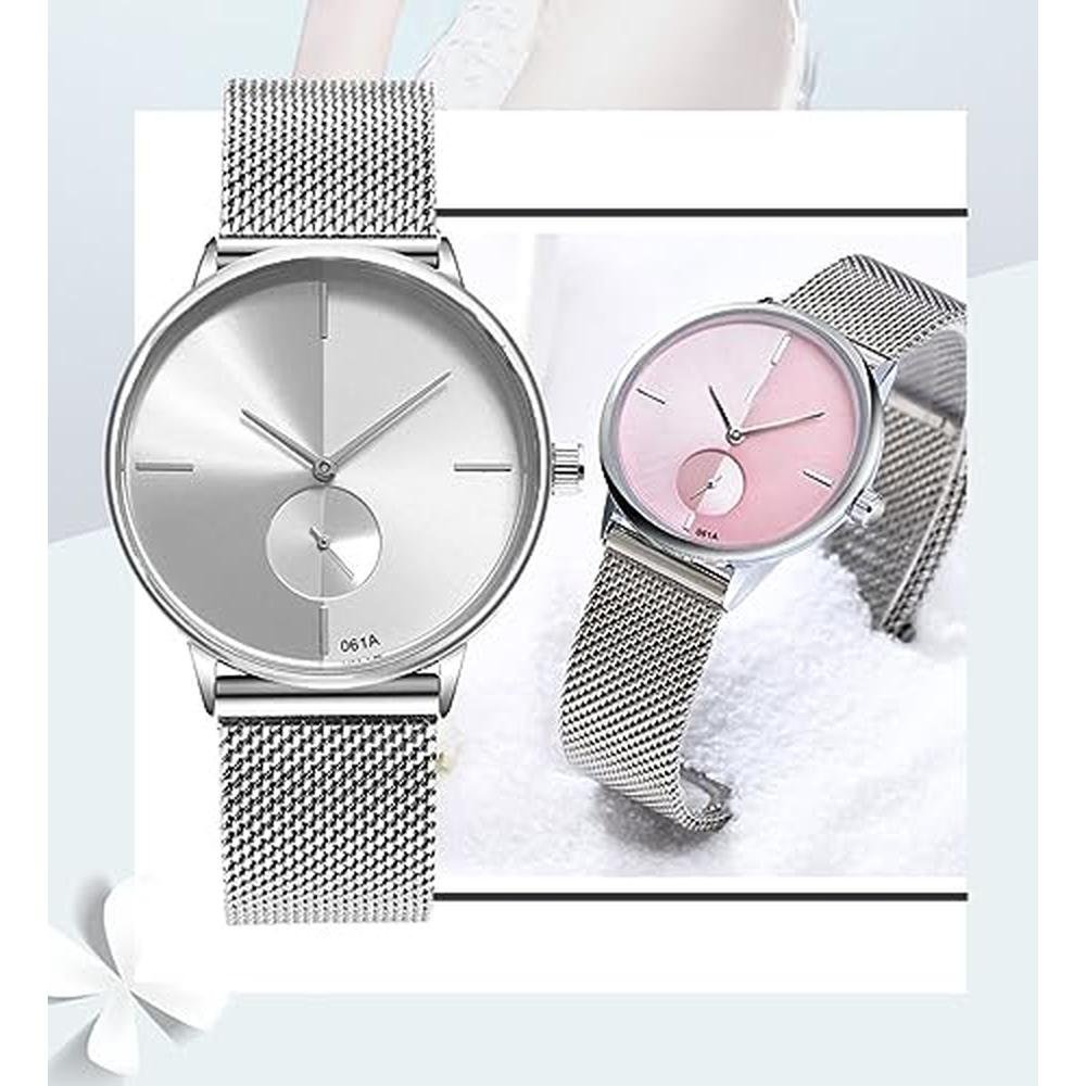Ultra Thin Simple Couples Watches His and Hers Stainless Steel Mesh Strap Pair Watch Gifts Set Men and Women Quartz Watches (White Pink)