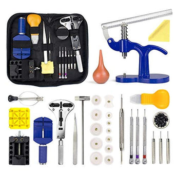 The watch repair tool kit suits for both professionaland general use. Many of the tools are included to do the most common tasks like watchband adjustment, opening watch backs, changing watch batteries, changing watch gaskets, adjusting watch bands, and more. Small, clean and functional, this watch repair tool kit helps you get your watch problem done at home instead of going forwatch repair shops.Package includes:1 X disassembly table ware1 X watch Case Opener(55mm)+18 X adjustable Case Opener Pins1 X watch case holder tool1 X watch Press+12 X nylon dies1 X spring bar tool1 X take the needle clamp1 X bellows1 X pry knife1 X hammer3 X punch needle(0.8mm, 0.9 mm,1.0mm)3 X screwdriver(1.2mm, 1.4 mm,1.6mm)1 X plastic Watch Band Holder1 X tweezers1 X Cleaning Cloth