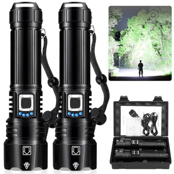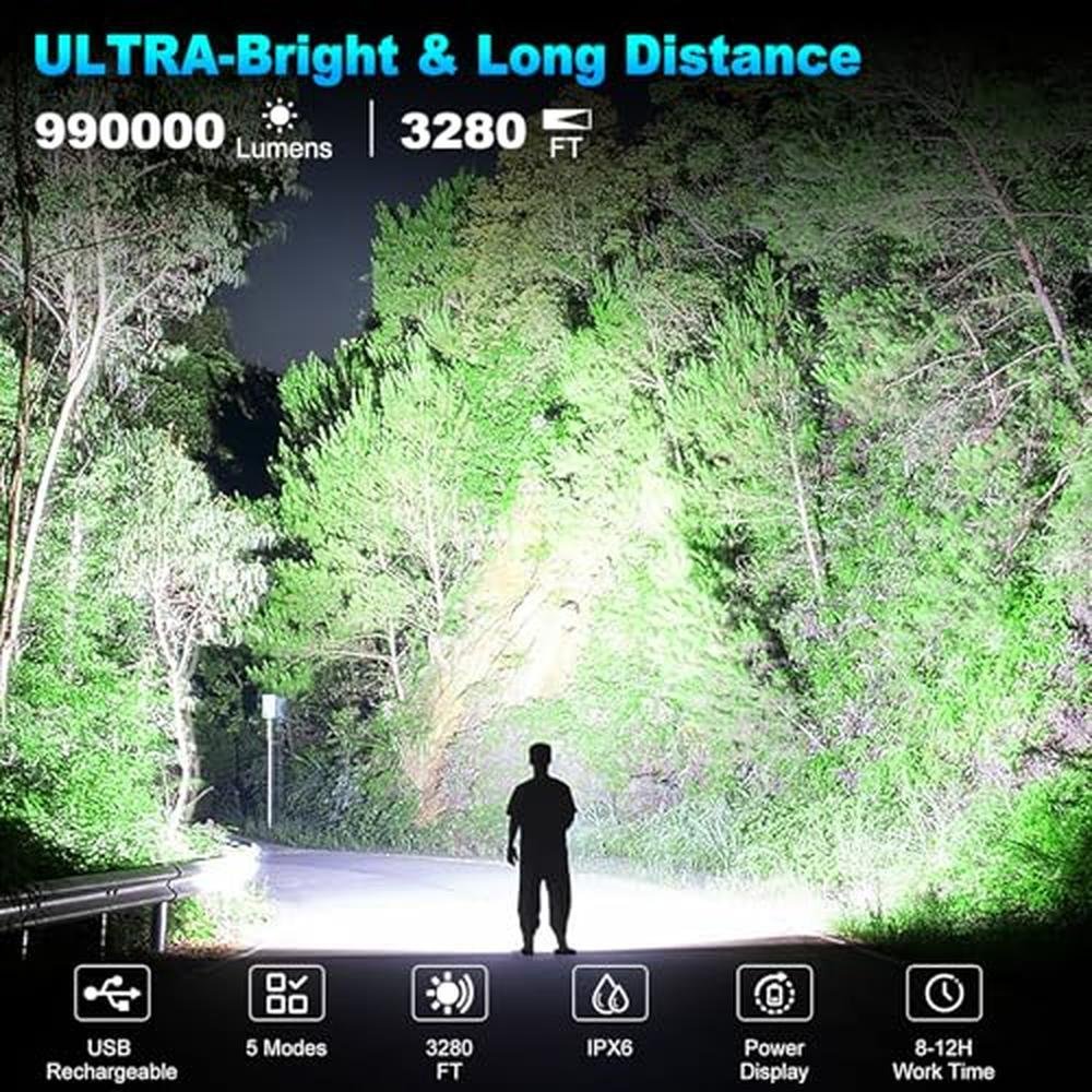 • 99000 Lumens FlashlightCinlinso rechargeable led flashlight uses the latest super bright LED chip, 10 brighter than other flashlights. Projects a super bright beam of light that clearly illuminates things within 3280 feet, easily lighting up an entire room or backyard. This brightest flashlight can be easily used in various situations such as camping, huting or emergecies.