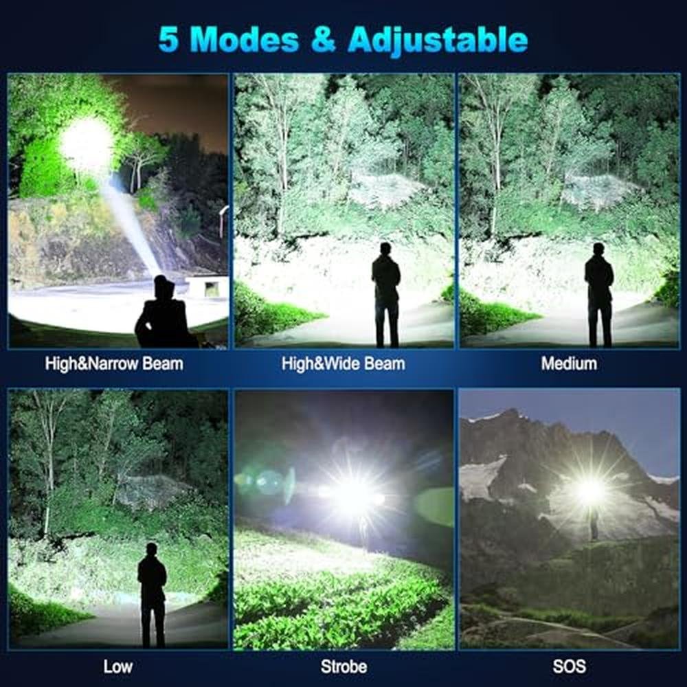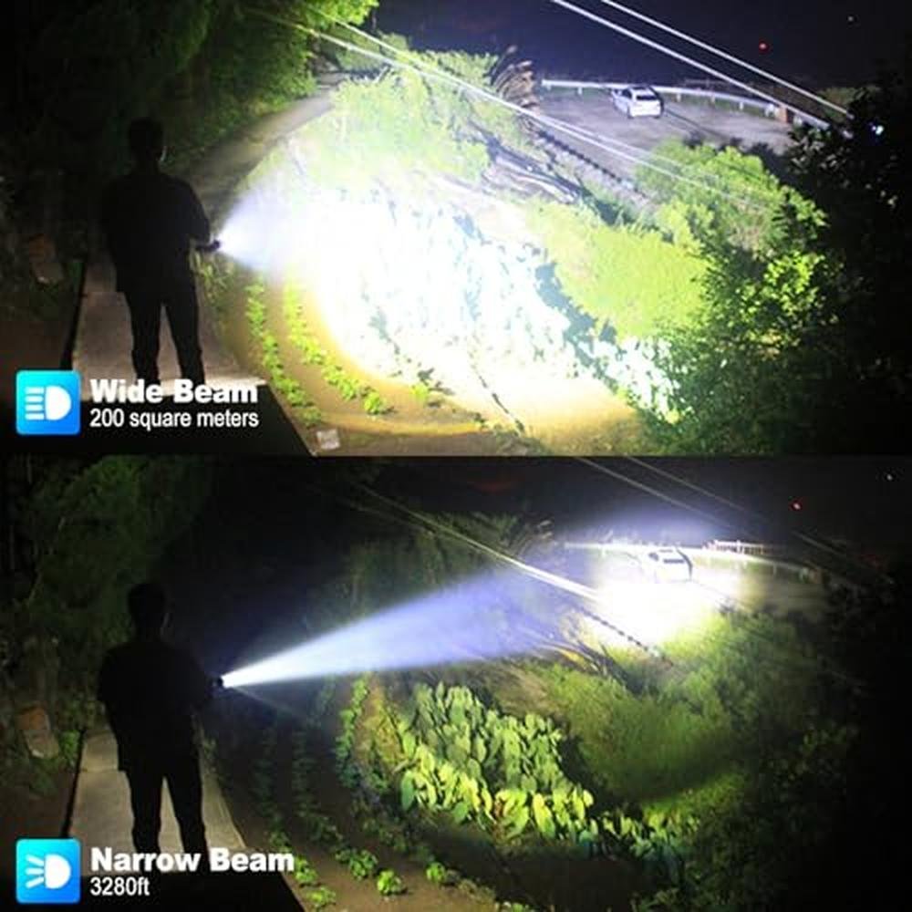 • Adjustable FunctionThis powerful flashlights can switching between in wide beam and narrow beam by pulling and pushing the head. The wide beam Lighting, provide you with bright and wide vision when you walk at night, dispel the darkness and provide you with a full sense of security. the narrow beam lighting for long-range observation, max beam range to 3280ft, accurately help you detect the field of vision, allows you to see objects in the distance more clearly.
