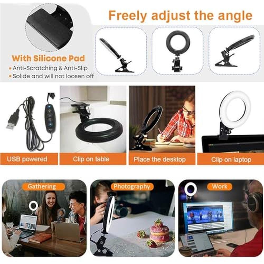 Clip onVideo Conference Lighting Kit ring light Perfect for Laptop,Monitor,Computer, Desk, or any flat surface bracket,The Maximum wide of this for Clip:1.35 inch. 3200K-6500K5 level Brightness,5 modes to simulate the natural light of the sun for your free choice to get the perfect lighting and more natural visual. Application scenariozoom lighting for computer,laptop light for video conferencing,lighting for video conferencing,photography lighting,webcam lighting,Clip on computer lights ,ring light for laptop 100% CUSTOMER SATISFACTION30 Days Money Back and One Year Warranty. Product Features: 1.Adjustable brightness 2.Easy clip installation 3.360 degree adjustment of fill light angle 4.Simulate natural light-adjustable color temperature 5.Computer USB direct power supply product parameters: Product Name : On-Camera Video Lights Ring size:4.6 inch Power supply : Standard USB 5V 2A or above The Maximum wide of this for Clip:1.35 inch Led color temperature : 3200K-6500K Lamp power :maximum 10W Material : ABS+PC ring light, ring light for laptop,webcam light,camera light,video conference lighting ,ring light camera,ring light for computer monitor usb