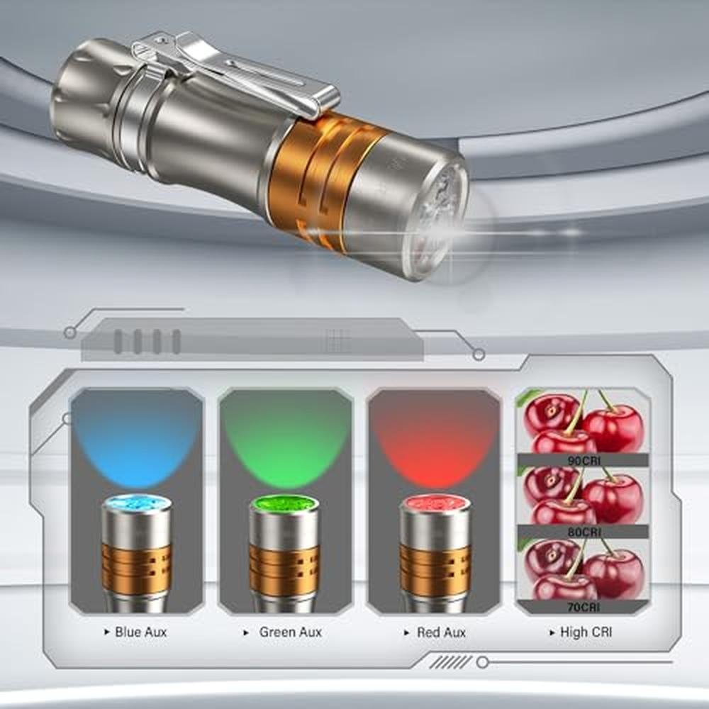| Special Feature | Titanium alloy shell, Pocket mini EDC flashlight, Simple & Advanced Anduril UI 2.0, 3*RGB AUX LEDs, tail mechanical switch, 1400 high lumens, 3*main 90CRI LEDs |