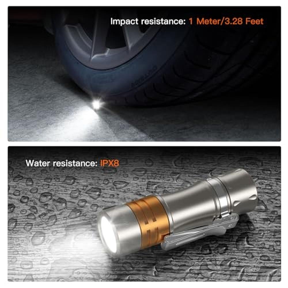 - New Material: Titanium AlloyThe new small powerful flashlight uses a titanium alloy shell, which is more Firmly and not afraid of corrosion, more heat-resistant and stable, just like a cigar, but shorter than a cigar, its size: 2.81 inches (length) 0.83 inches (head diameter), and weighs 1.6 ounces (with batteries), the perfect choice for a small, bright, and affordable light that you can take anywhere.