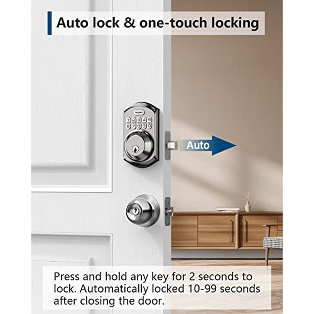 Experience unparalleled convenience and security with TEEHO's TE001 Keyless Entry Door Lock with Keypad. This advanced single-cylinder deadbolt lock boasts a satin nickel finish and comes with 2 spare keys for added security. With its auto-lock feature, you can rest assured that your front door is secure even when you're not home. Plus, the easy installation process makes it a breeze to set up. Say goodbye to traditional keys and hello to the convenience of a keypad lock. Unlock the ultimate in smart locking technology with TEEHO's reliable and secure keypad deadbolt locks, featuring a sturdy zinc alloy and stainless steel frame. Enjoy keyless freedom with 20 access codes for family use and an available temporary code for the single guest entry. Assign a one-time code for service personnel or grant family members, friends, or visitors access with their own unique password. Smart-locking 'Automatic door lock' can be set to lock automatically in 10-99 seconds; 'one-touch auto-lock' can press and hold any key on the keypad for 2 seconds to lock the door. Experience the peace of mind that comes with TEEHO's smart door locks, designed to provide you with the ultimate in security and convenience.