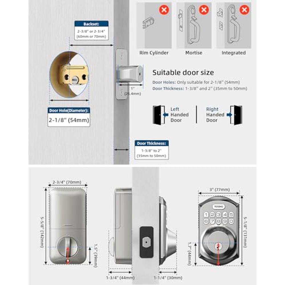 | Included Components | TE001 deadbolt door lock, 2 Standard Key, Latch, Strike Plate, Installation Instructions, Programming Instructions |