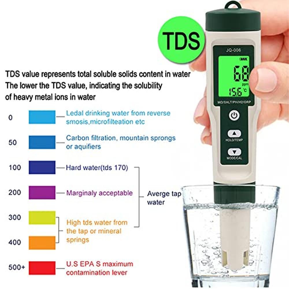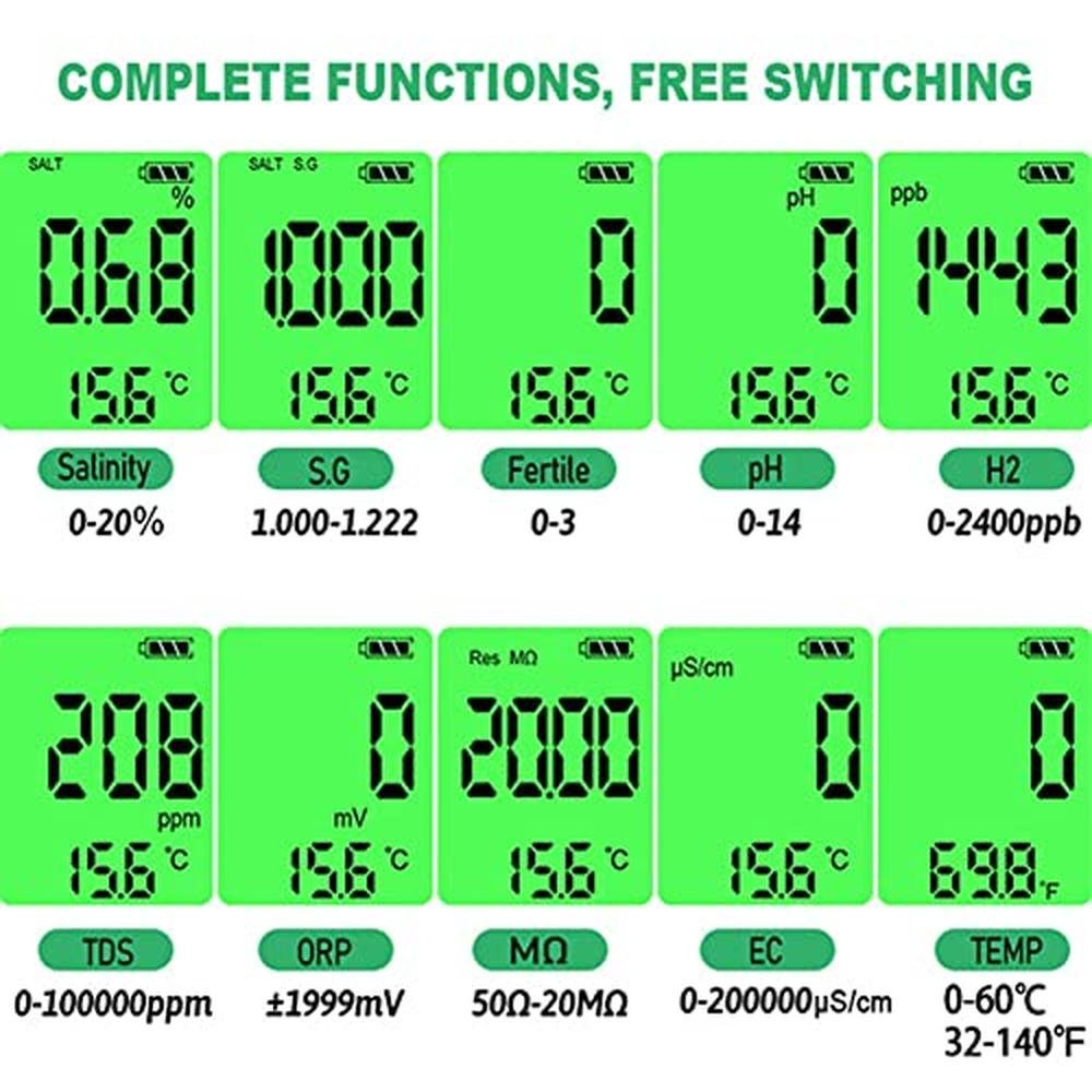 - 10 in 1 Function: Digital water tester for measuring PH, TDS, SALT, SG, ORP, EC, Hydrogen, Resistivity, Temperature and Nutrient.