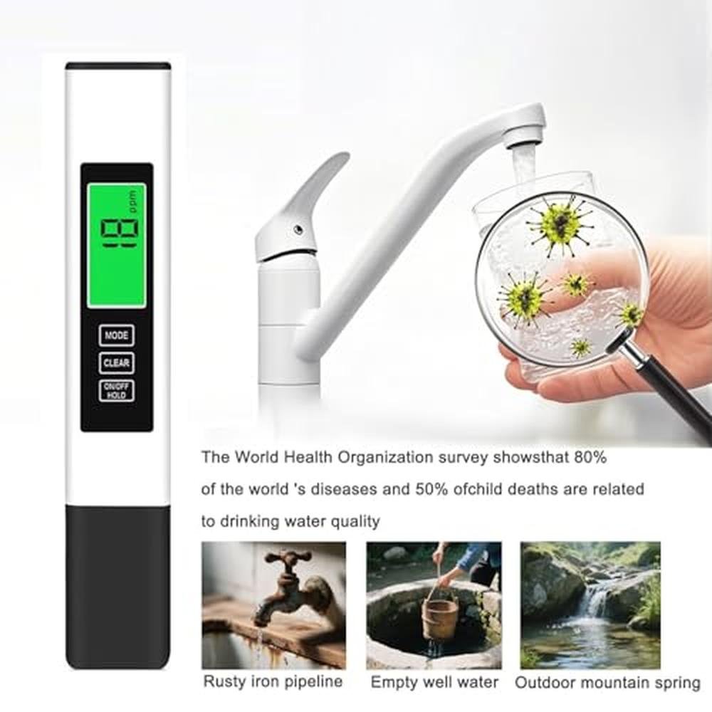 - 4-in-1 Multifunction Tester (TDS/EC//)This portable water tester for drinking water detects multiple key parameters with intuitive operation, making water safety monitoring effortless for every household. Featuring one-touch data hold and factory pre-calibration, it's ready to measure immediately upon startup.