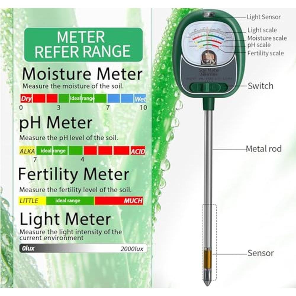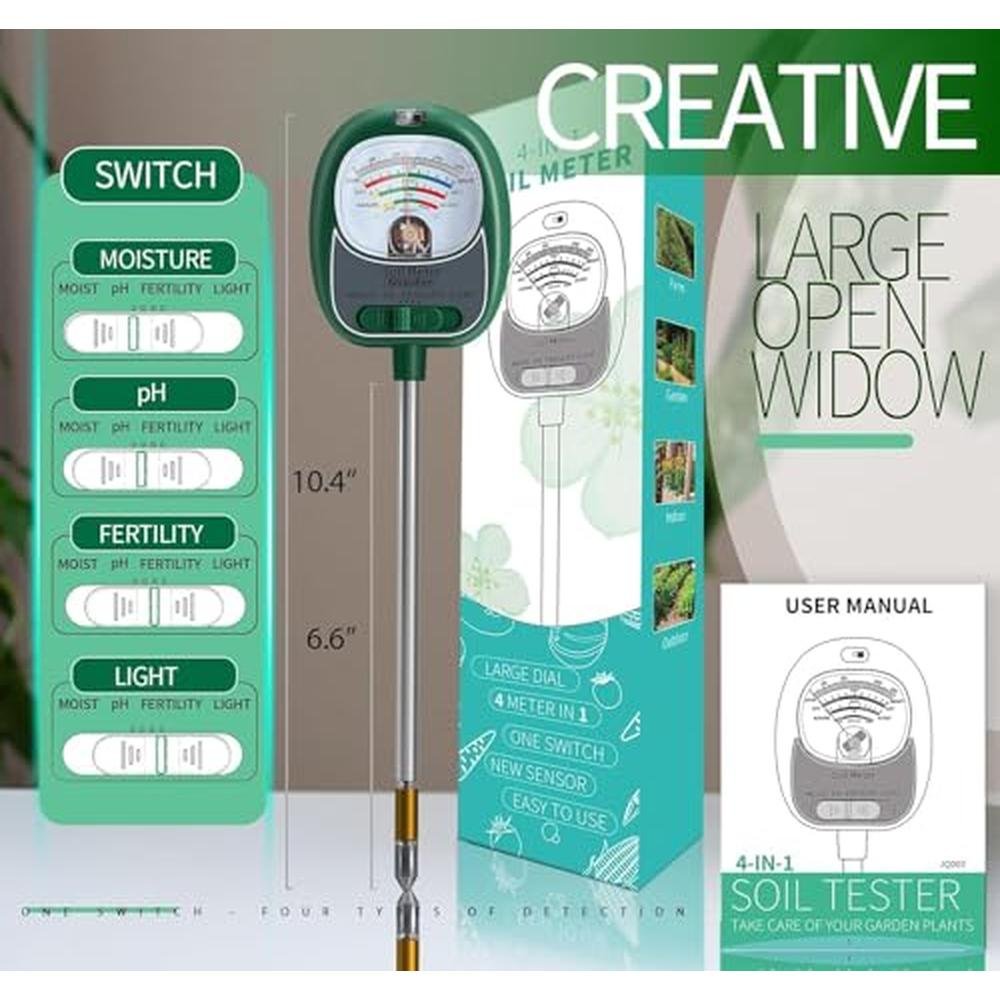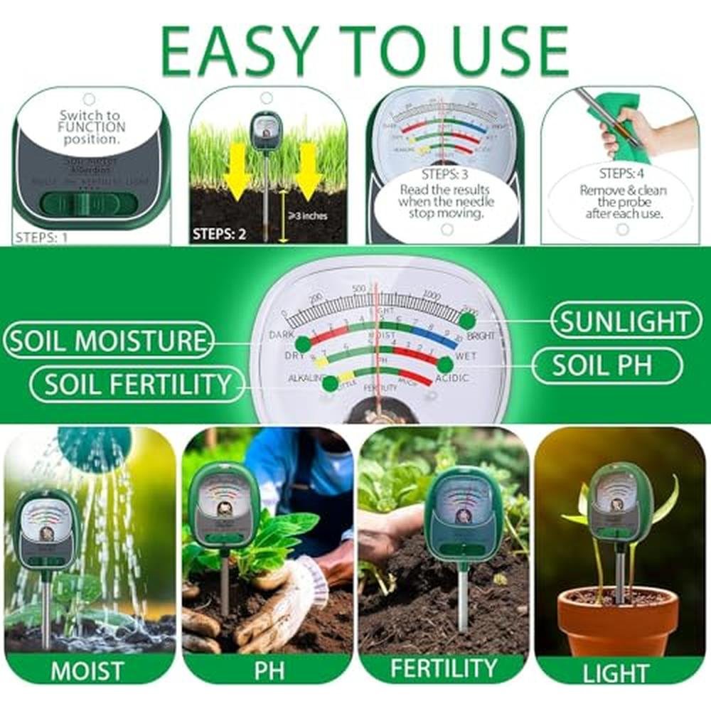 4 in 1 Functions Soil Test Kit: Soil moisture meter+soil ph meter+fertility+light meter, is specially designed for planting beginners. The upgraded sensitive testing sensor can fast-test and meet most of your needs for measuring the soil moisture, pH, fertility, and sun-light, helping you cultivate seedlings scientifically and plant lush plants.