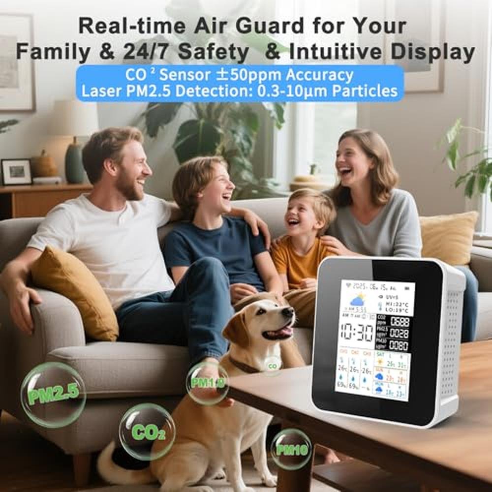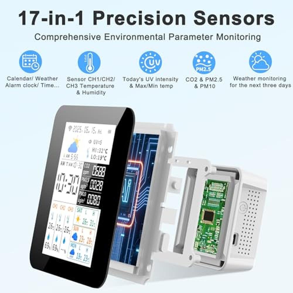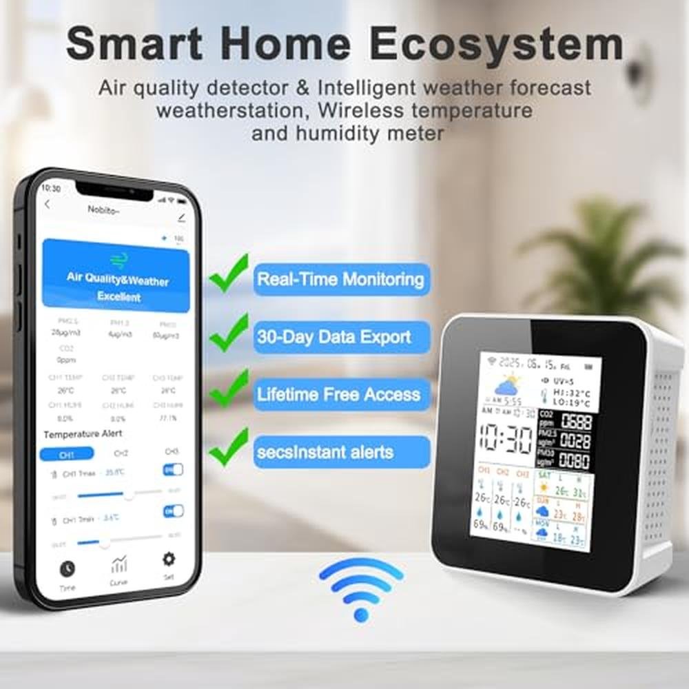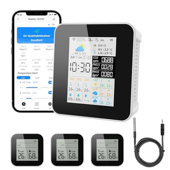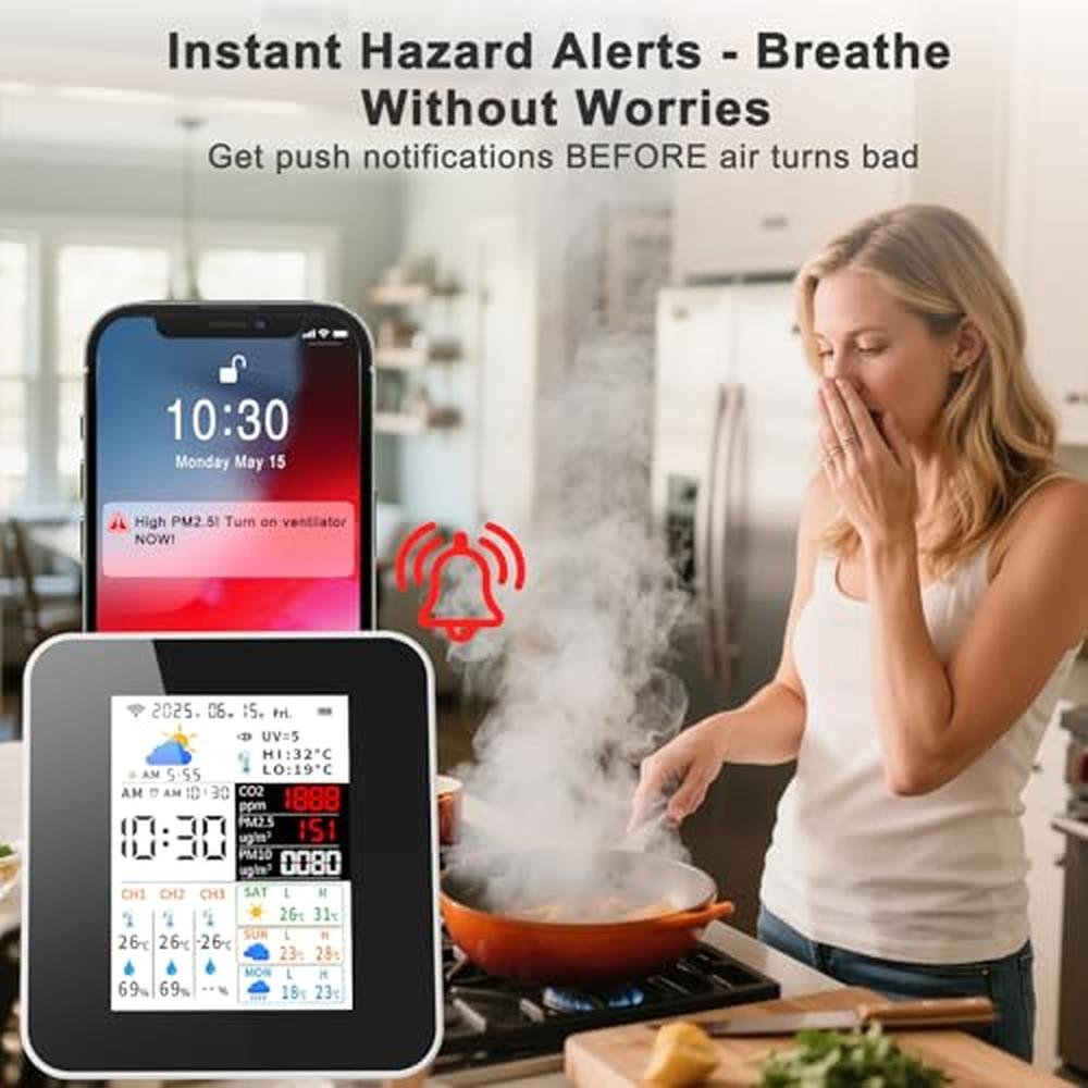 This all-in-one air quality monitoring system uses advanced high-precision sensors to track over 17 key parameters, including NDIR CO2, PM2.5, temperature, humidity, and UV index, ensuring lab-grade accuracy for comprehensive air safety. It features a main unit and three wireless sub-sensors that monitor different areas, such as your nursery, kitchen, office, and outdoors, syncing via the Tuya app to provide real-time alerts for hazards like PM2.5 spikes or high CO2 levels. The system also includes customizable temperature and humidity monitoring with separate max/min alarm settings for each sensor, along with a 2-meter high-precision waterproof probe for versatility. In addition, it functions as a weather station with 3-day forecasts, calendar, and free lifetime app access for viewing 365-day air quality history and remote monitoring. This wireless, sleek design replaces traditional devices like thermometers, hygrometers, and weather stations, offering quick 60-second setup and 24/7 security for your home, family, and pets.