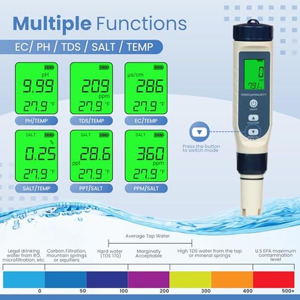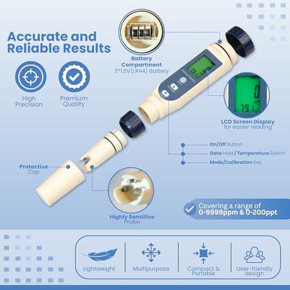 Introducing the PUREFIZ Digital Salinity Meter, your comprehensive solution for precise water quality testing. At PUREFIZ, we believe that access to clean and safe water is essential for everyone. Our 5-in-1 multi-parameter tester combines Salinity, TDS, EC, pH, and Temperature measurements in one compact device, making it the perfect tool for a wide range of applications, from pools and aquariums to hydroponics and spas. Key Features: Multifunctional 5-in-1 Tester: The PUREFIZ Digital Salinity Meter is designed to provide accurate measurements for Salinity, TDS, EC, pH, and Temperature, all in one device. Whether you need to test pool water quality, monitor marine conditions, or ensure optimal aquarium environments, this tester has you covered. Three Display Modes for Salinity Measurement: With PPM, PPT, and % displays, our meter allows you to effortlessly monitor salinity levels in various settings. The range includes 0-9999ppm for pools, 10-200ppt for marine water, and 0.01-25% for food, eliminating the need for complex calculations. User-Friendly Design: Featuring a large backlit LCD screen and simple button controls, the PUREFIZ tester is easy to use and read. Its compact and portable design ensures you can test water quality anywhere, anytime. High Accuracy and Reliability: Equipped with a high-precision titanium alloy probe, the PUREFIZ meter delivers quick and accurate readings. This ensures reliable performance for all your water testing needs, from pool maintenance and aquarium care to spa and hot tub monitoring. Battery-Powered Convenience: The PUREFIZ Digital Salinity Meter is powered by 3x 1.5V (LR44) batteries, ensuring long-lasting performance and allowing you to use the meter in various locations without worrying about recharging. The battery compartment is easy to access for quick replacements.