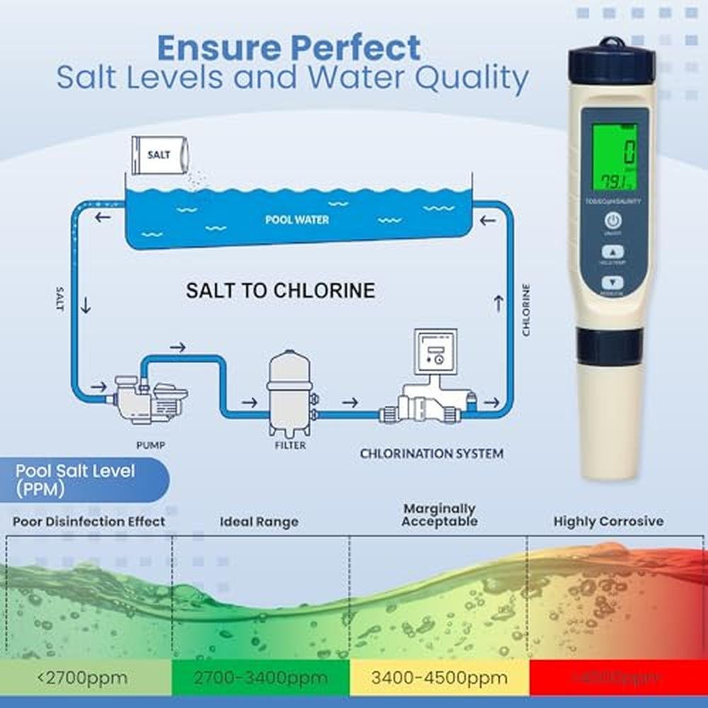 - SIMPLE POOL SALT TESTER: Using the PUREFIZ pool salt tester is straightforward. Just turn it ON, press the MODE button to select salinity, and start testing. Designed for ease, its ideal for pools, saltwater aquariums, koi ponds, and more.