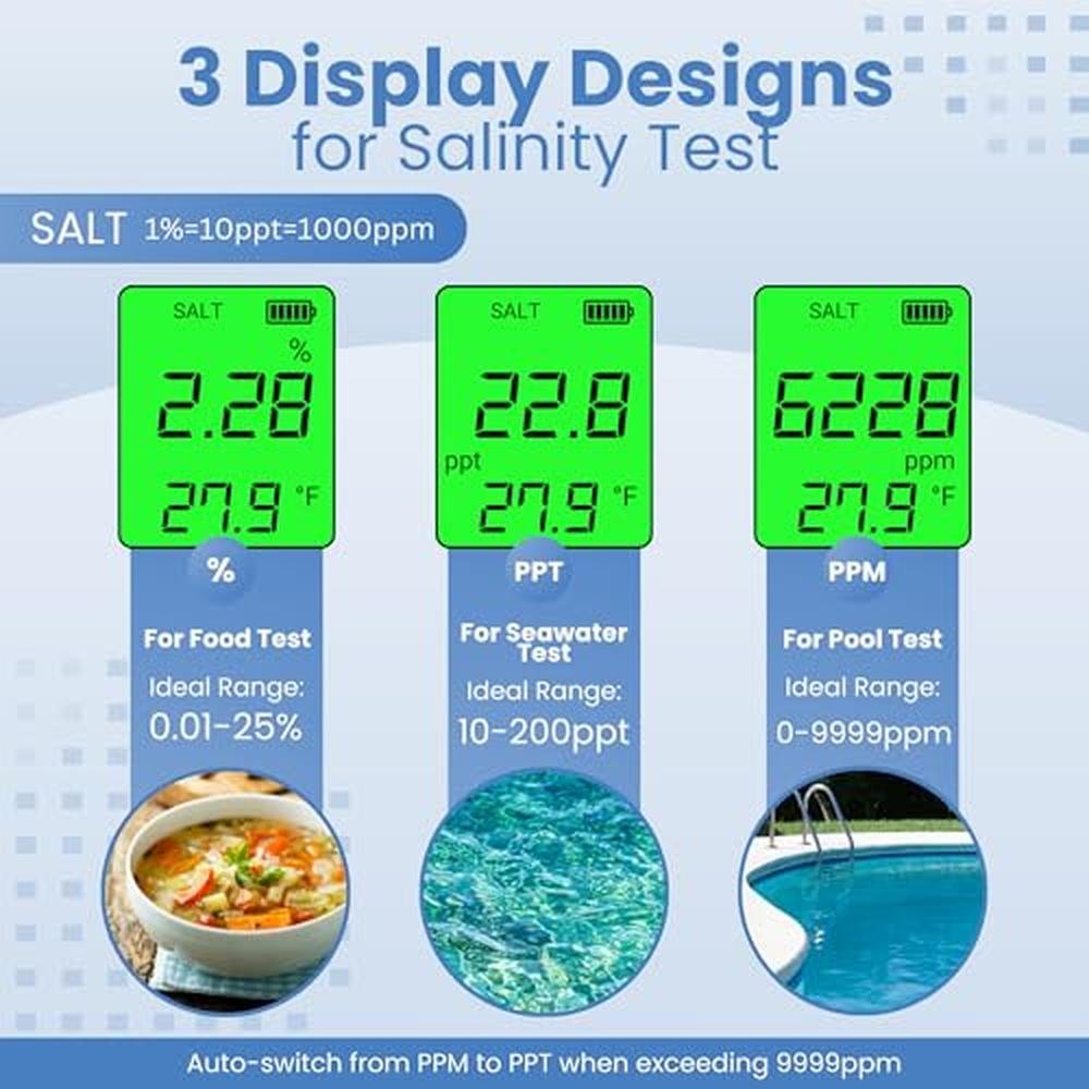 - THREE MODES FOR SALINITY TESTING: The PUREFIZ salinity meter offers simple readings in PPM, PPT, and %. For pool salt tests, measure up to 0-9999ppm; for seawater, it reads 10-200ppt, automatically switching when ppm exceeds 9999. It even measures food salt content (0.01-25%) without complex calculations.