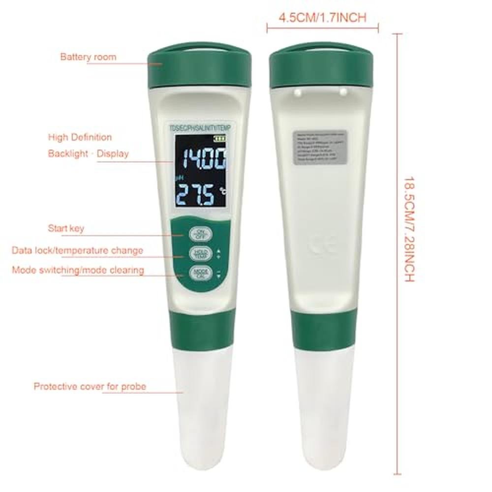 - Comprehensive Water Analysis Tool: This versatile 5-in-1 device measures salinity, pH, TDS (Total Dissolved Solids), EC (Electrical Conductivity), and temperature, delivering reliable results for pools, aquariums, and other aquatic environments.