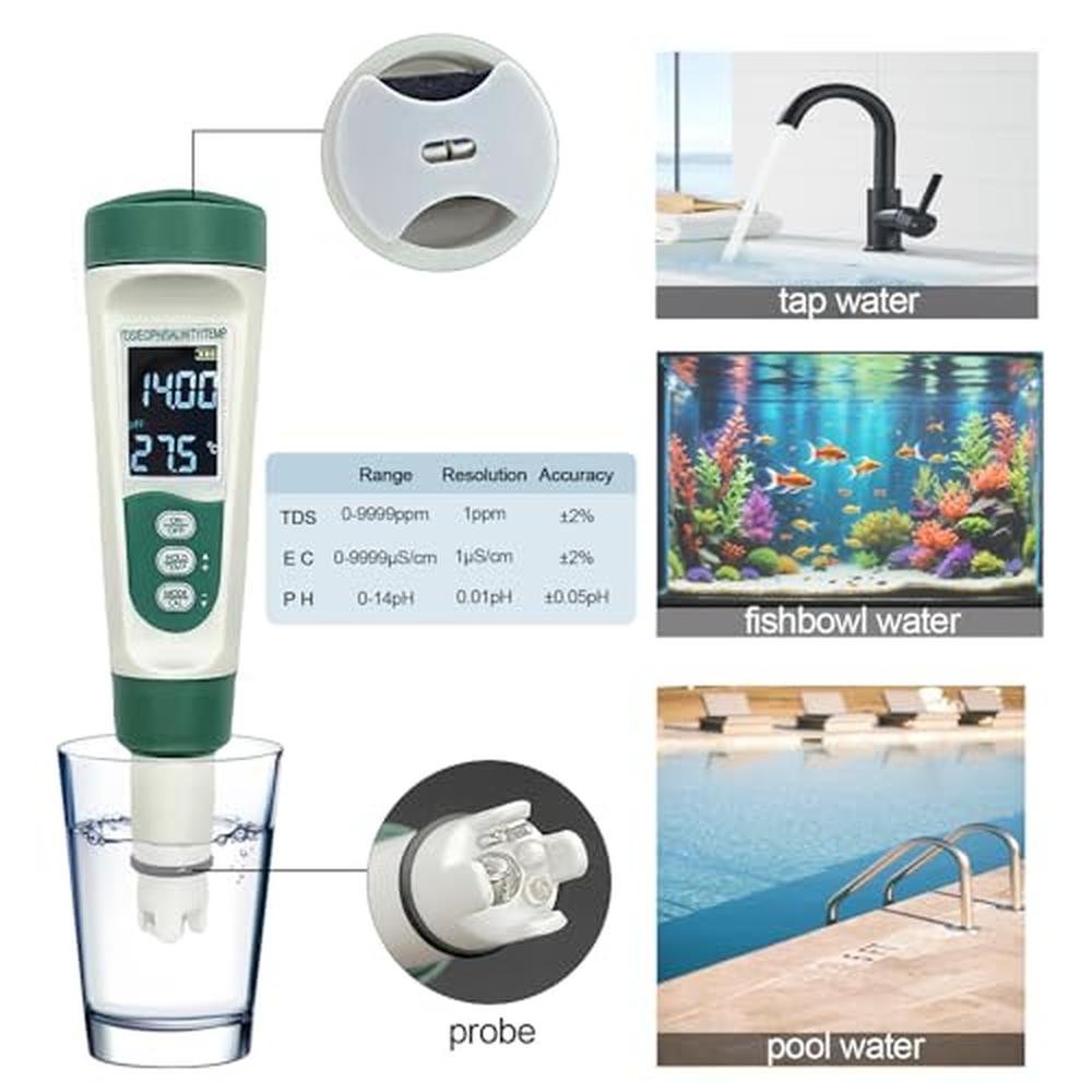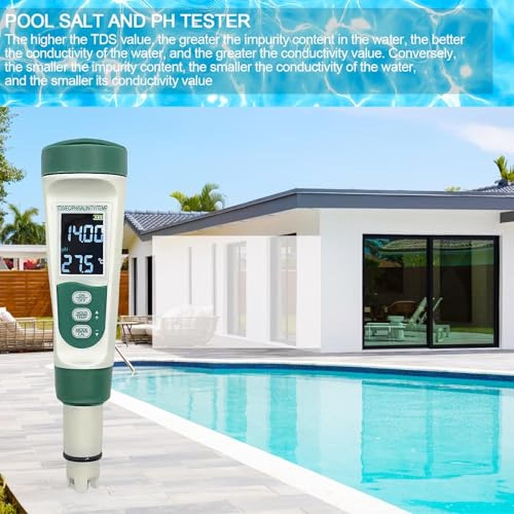 Maintain precise salt levels and consistent water quality in your pool, aquarium, or hot tub with this multifunctional 5-in-1 tester. It delivers accurate measurements of salinity, pH, TDS, EC, and temperature, providing a detailed overview of your water conditions.Equipped with advanced sensing technology, the device offers reliable and repeatable results, helping reduce uncertainty and support regular water maintenance. Whether you're a pool owner, aquarium enthusiast, or spa user, this versatile tool is essential for monitoring water balance and performance over time.The intuitive interface makes it easy to usesuitable for both beginners and experienced users, with no complex setup or calibration required. Simply dip the probe into the water to get instant readings on the clear LCD display, offering a convenient and efficient testing process.