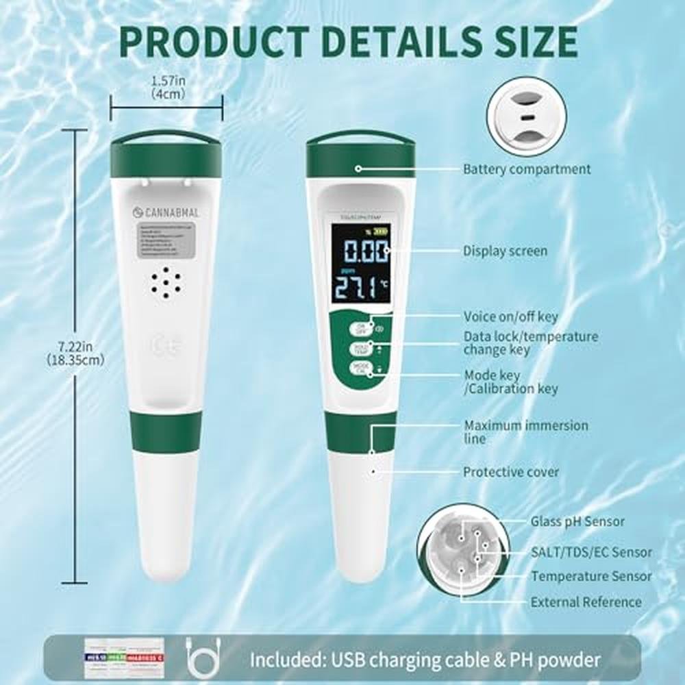 CANNABMALL 5-in-1 Digital PH Meter, with Voice Function, PH/TDS/EC/Temp/Salt Pool Salt Tester, Waterproof & Rechargeable Pen Meter for Swimming Pools, Fish Tank, Aquariums & Hydroponics
