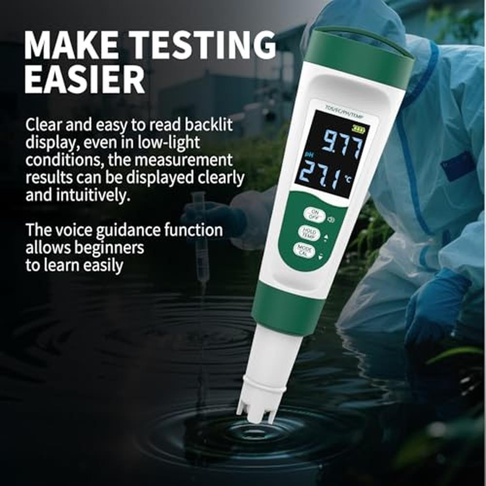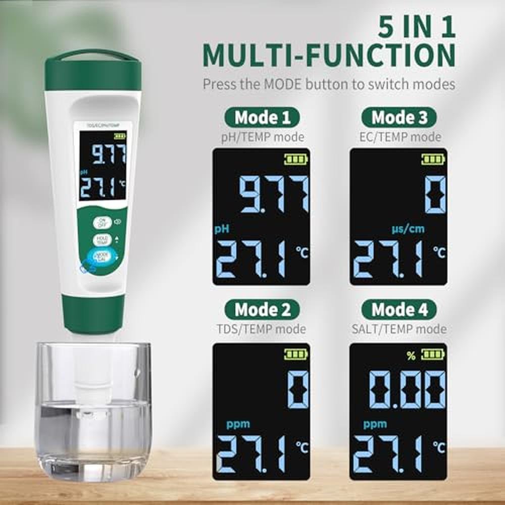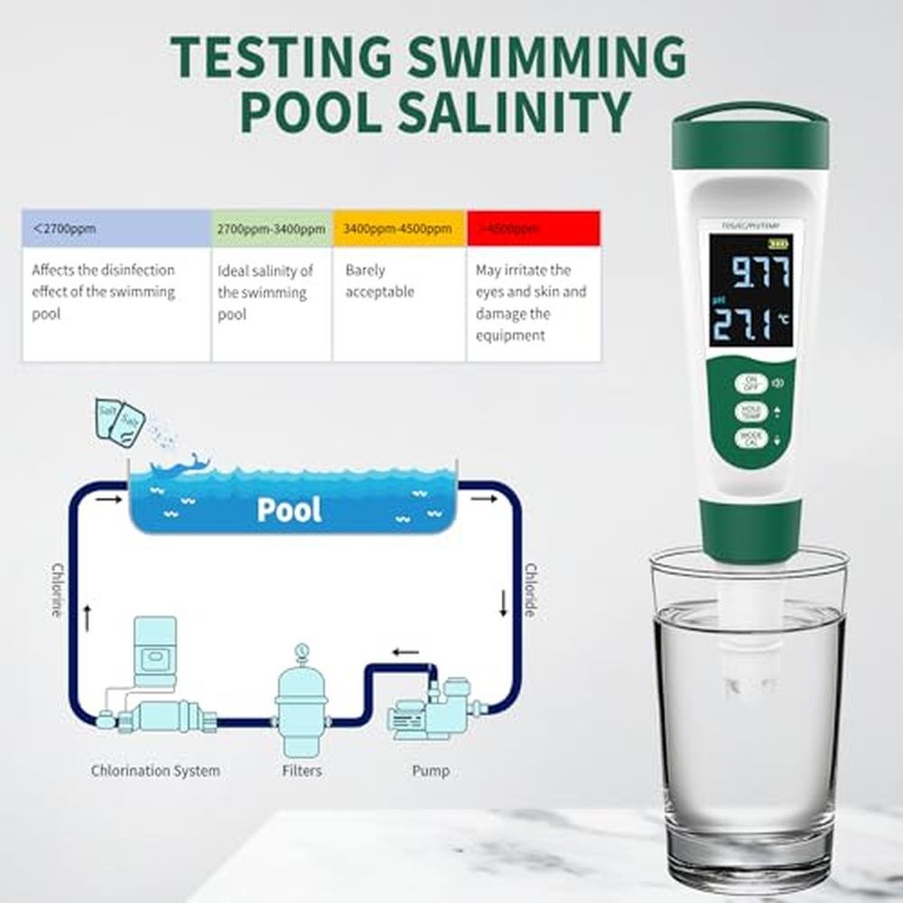 Your all-in-one water health monitor! Get instant, comprehensive water quality insights with our 5-in-1 digital pH Meter. Whether youre a pool owner, aquarium enthusiast, hydroponics enthusiast, or simply concerned about drinking water safety, this versatile tool is your ultimate solution. Easily perform comprehensive water quality testing: Accuracy you can trust: Precisely measures salinity from 0-9999ppm, covering the critical range (27003400ppm) required for effective chlorine production in most saltwater pools. Unparalleled pH accuracy: Resolution up to 0.01 across the entire pH range of 0.0014.00 provides exceptional accuracy. Ensure optimal conditions for your pool (ideal pH: 6.58.5), plant growth, or fish health. Extremely portable: Compact, lightweight, rechargeable design, reusable. Convenient for testing water quality anytime, anywhere! Voice function: The screen is clearly visible even with backlight, and the voice function makes it easy for beginners and professionals to use. Take control of your water quality: Ensure optimal pool water quality, promote plant growth, protect the health of your aquarium, or verify the purity of your drinking water. This versatile, professional-grade tester gives you complete control of your water quality.