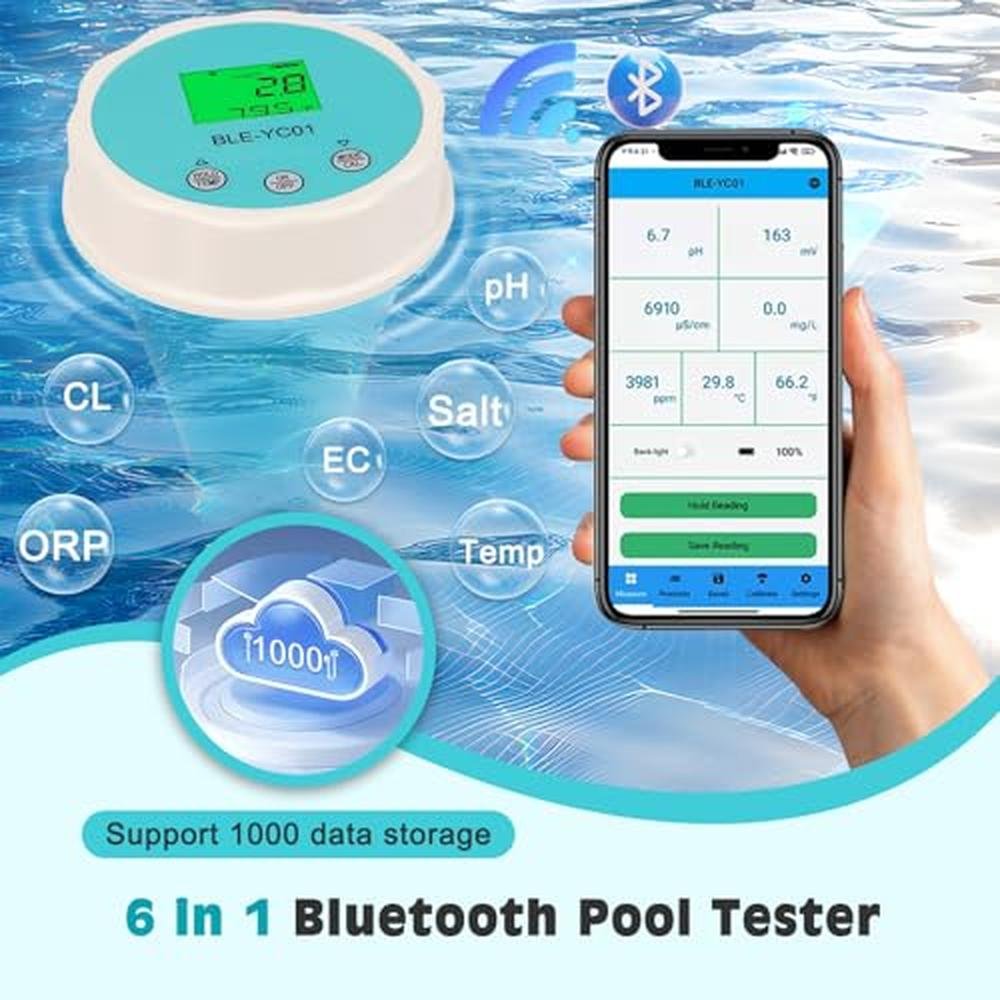 - [YINMIK Smart Pool Water Quality Tester]: The pH Chlorine Salt Test device is designed with Bluetooth function. Once connecting with YINMIK APP, you will view 6 test parameters at the same time, in addition, you can store 1000 data in APP and share with your family and print them, easy to operation.