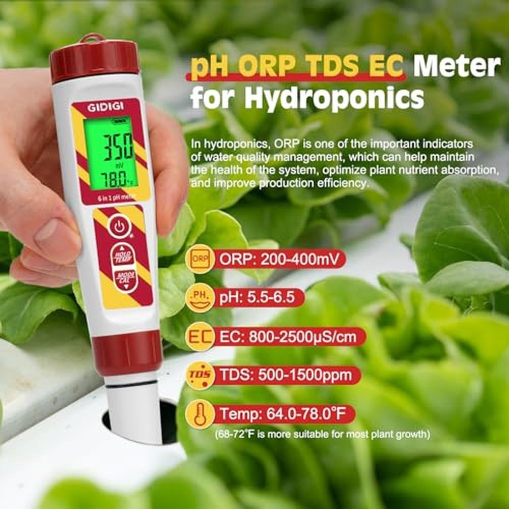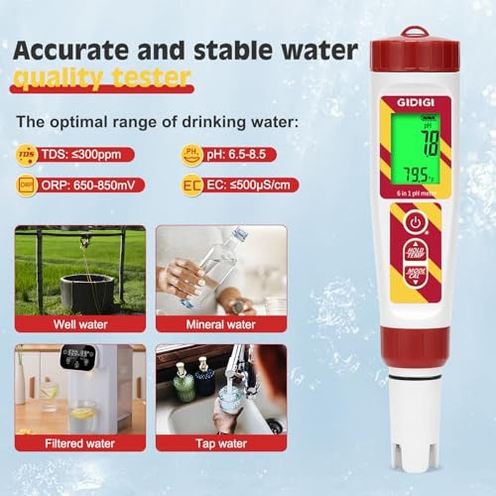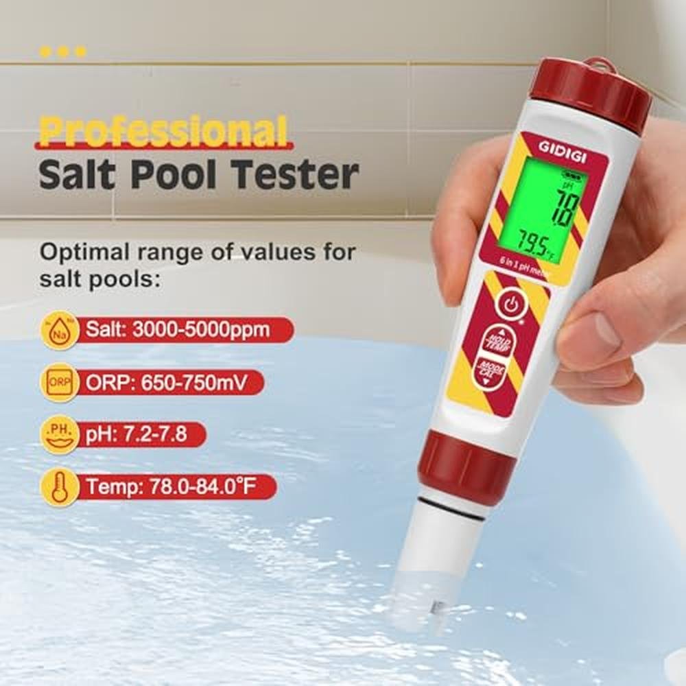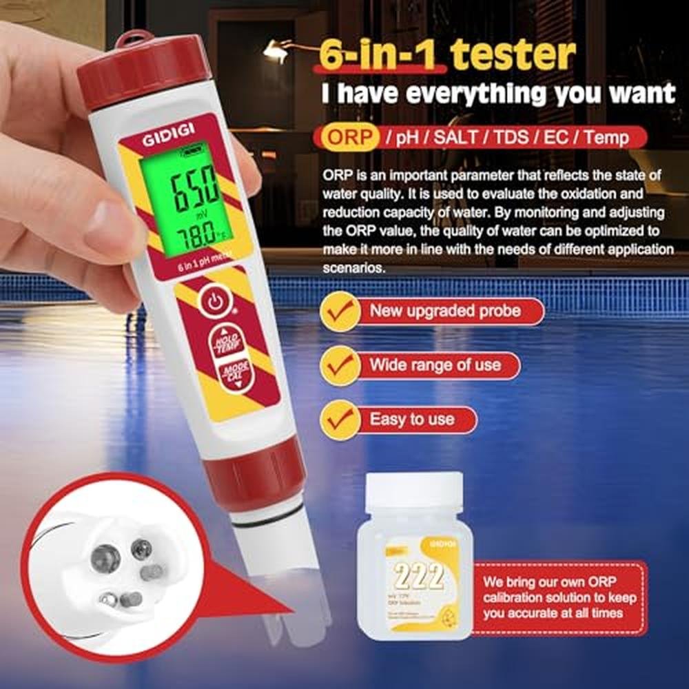 Digital pH Meter Pool Salt Tester,ORP Meter for Drinking Water,GIDIGI pH PPM for Hydroponic,6 in 1 TDS EC Salt Tester with ORP 222mV Calibration Solution for Aquariums,Spa,Drinking Water,Brewing