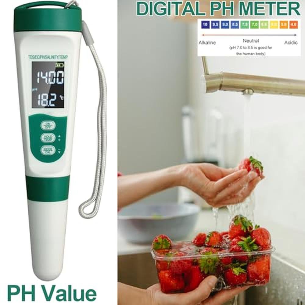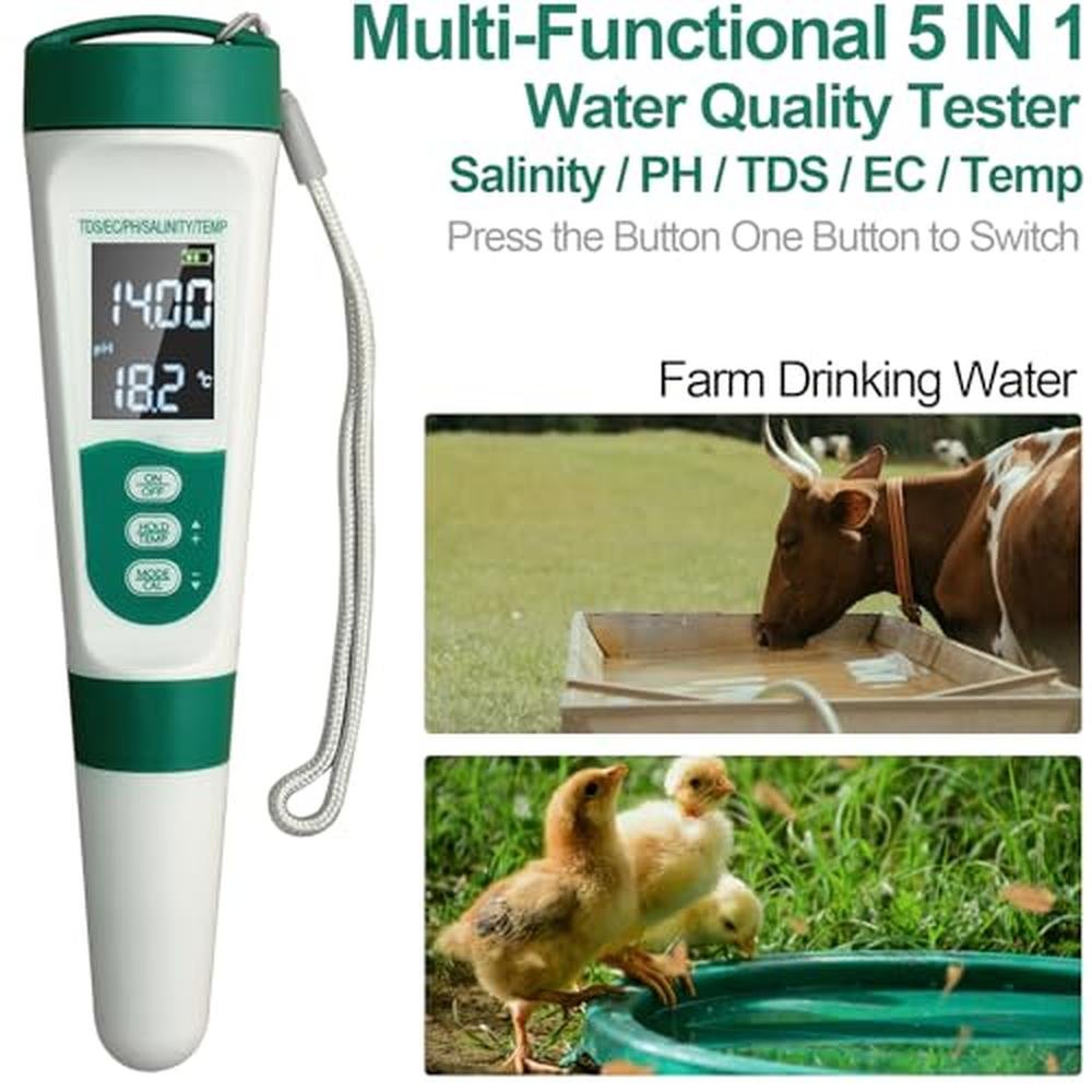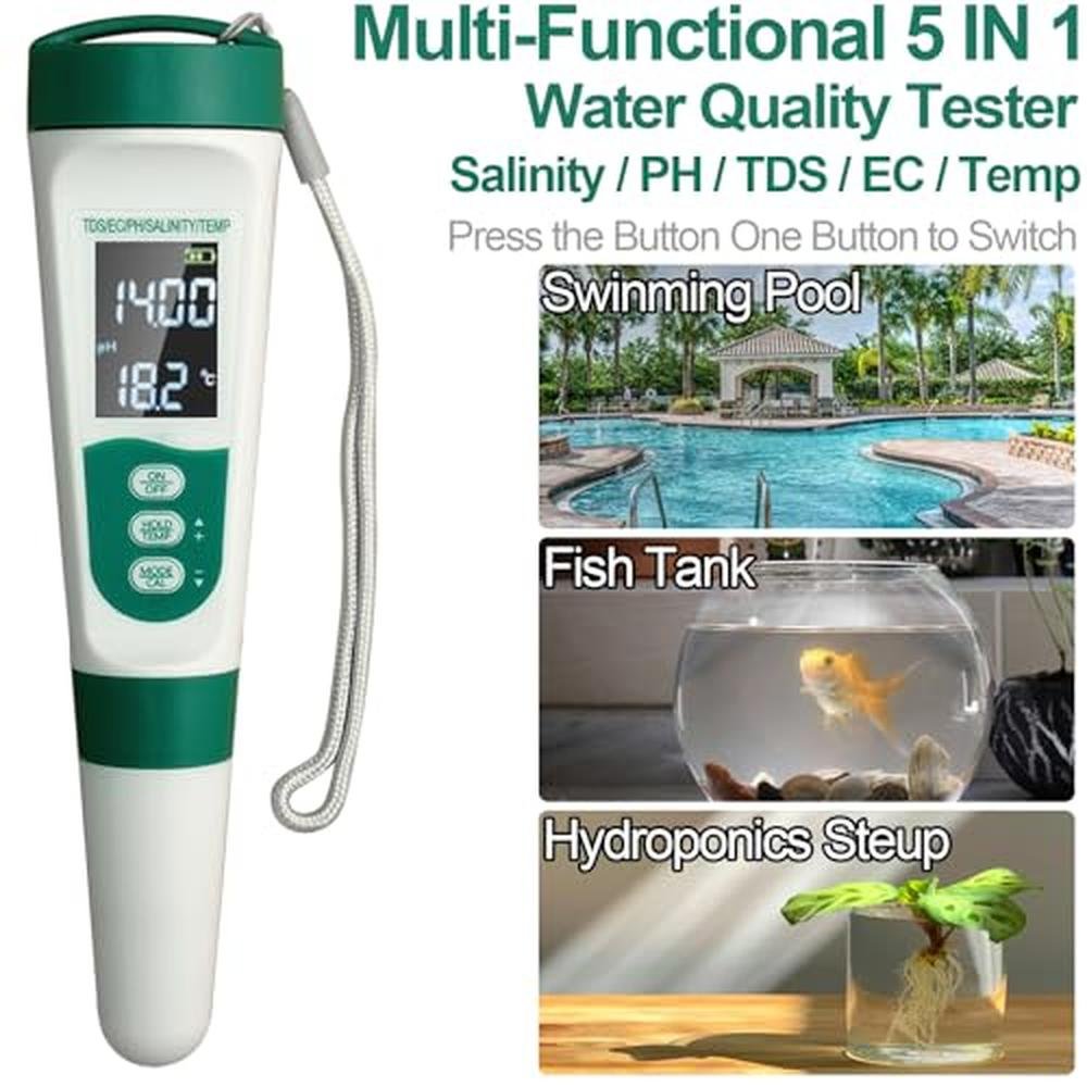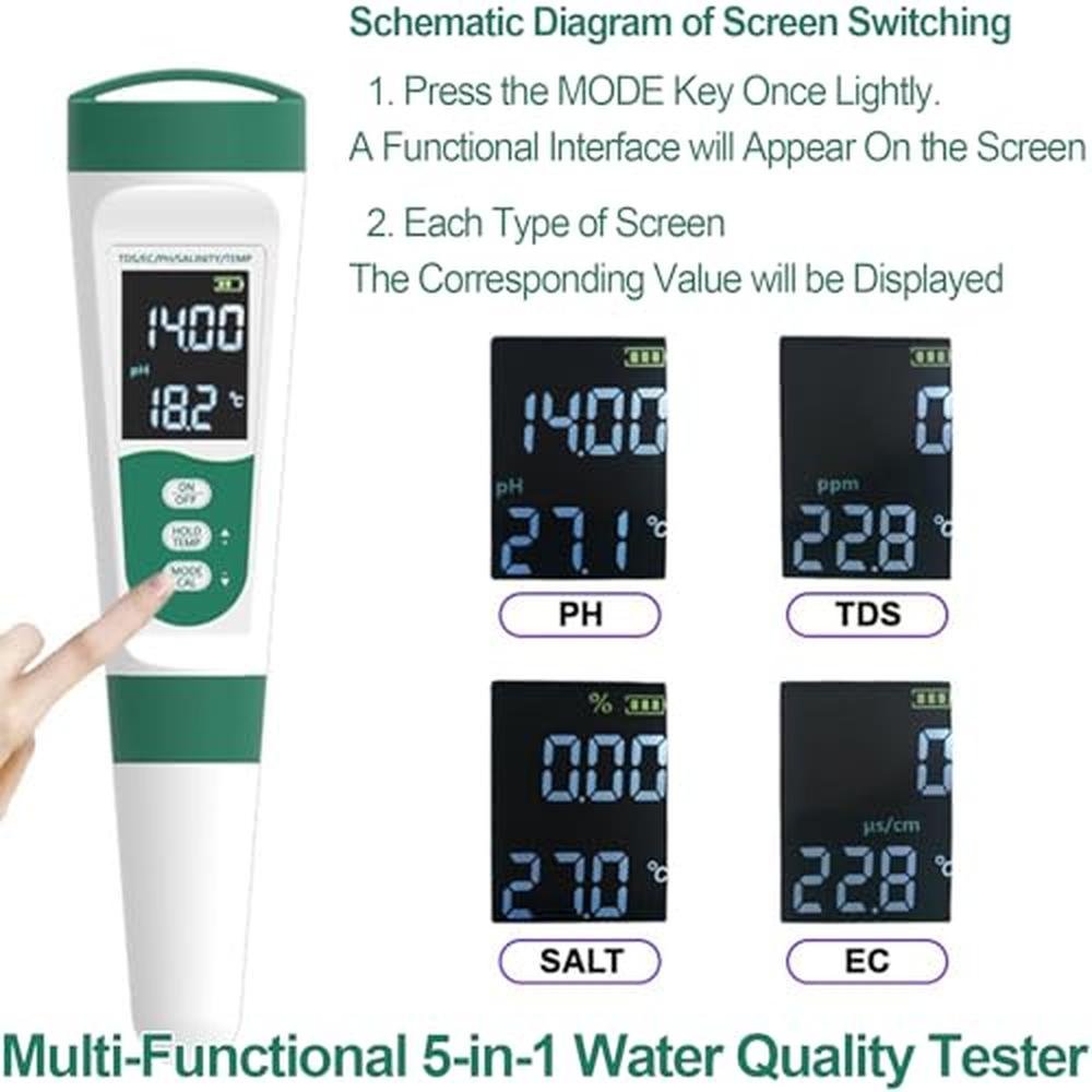 - Digital 5-in-1 Water Quality meter: It has 5 Different Detection Functions: Salinity + TDS + EC + PH + Temperature are Perfectly Combined Within 1 Meter. It Features High Precision, 0.01 Resolution, IPX5 Water Resistance and all-round Water Quality Monitoring. This not only Facilitates your Various Water Quality Testing Nneeds, But also Saves your Time and Money. It is Completely a Useful Water Quality Safety Testing Kit,Digital Pool Water Tester
