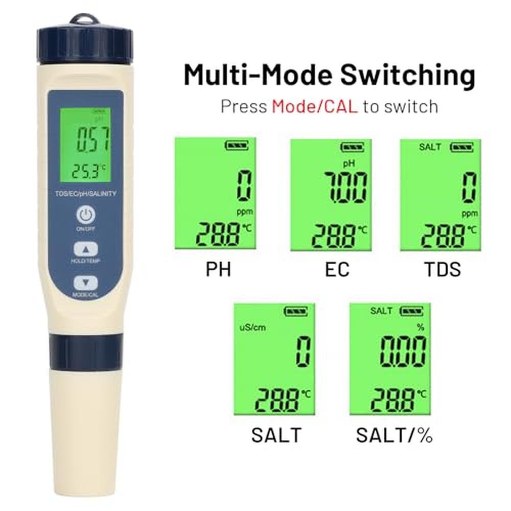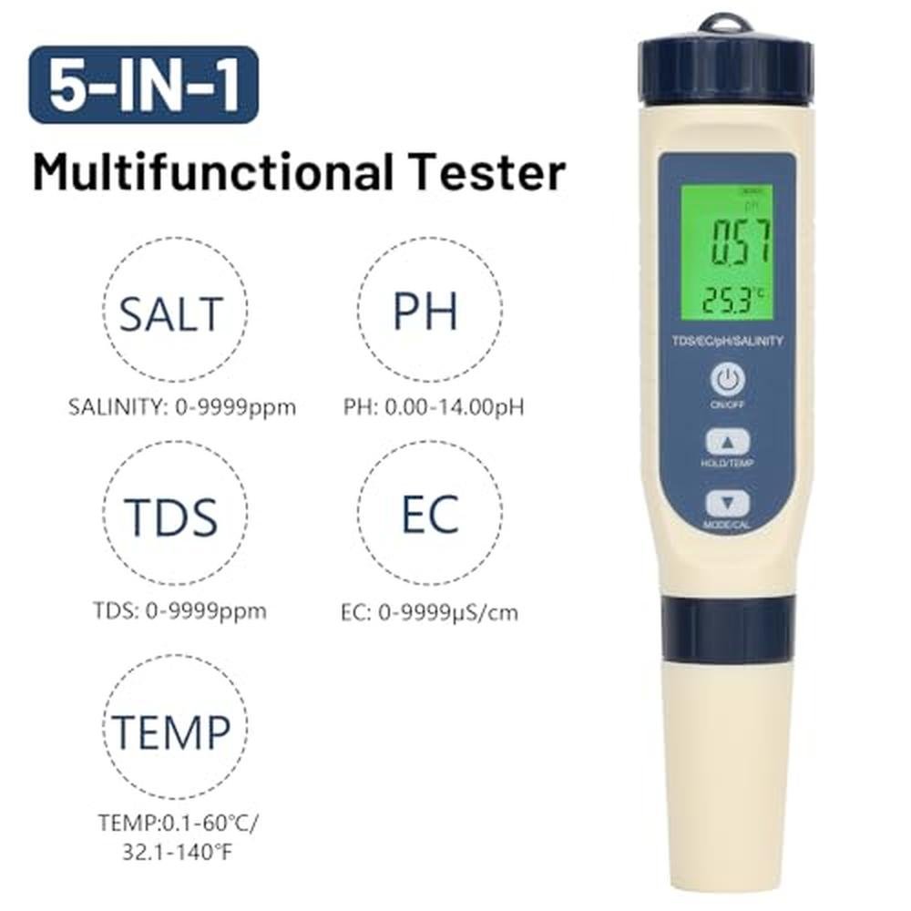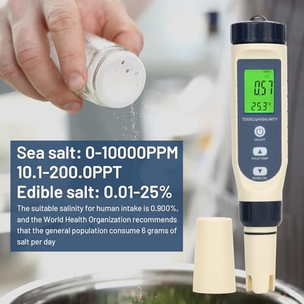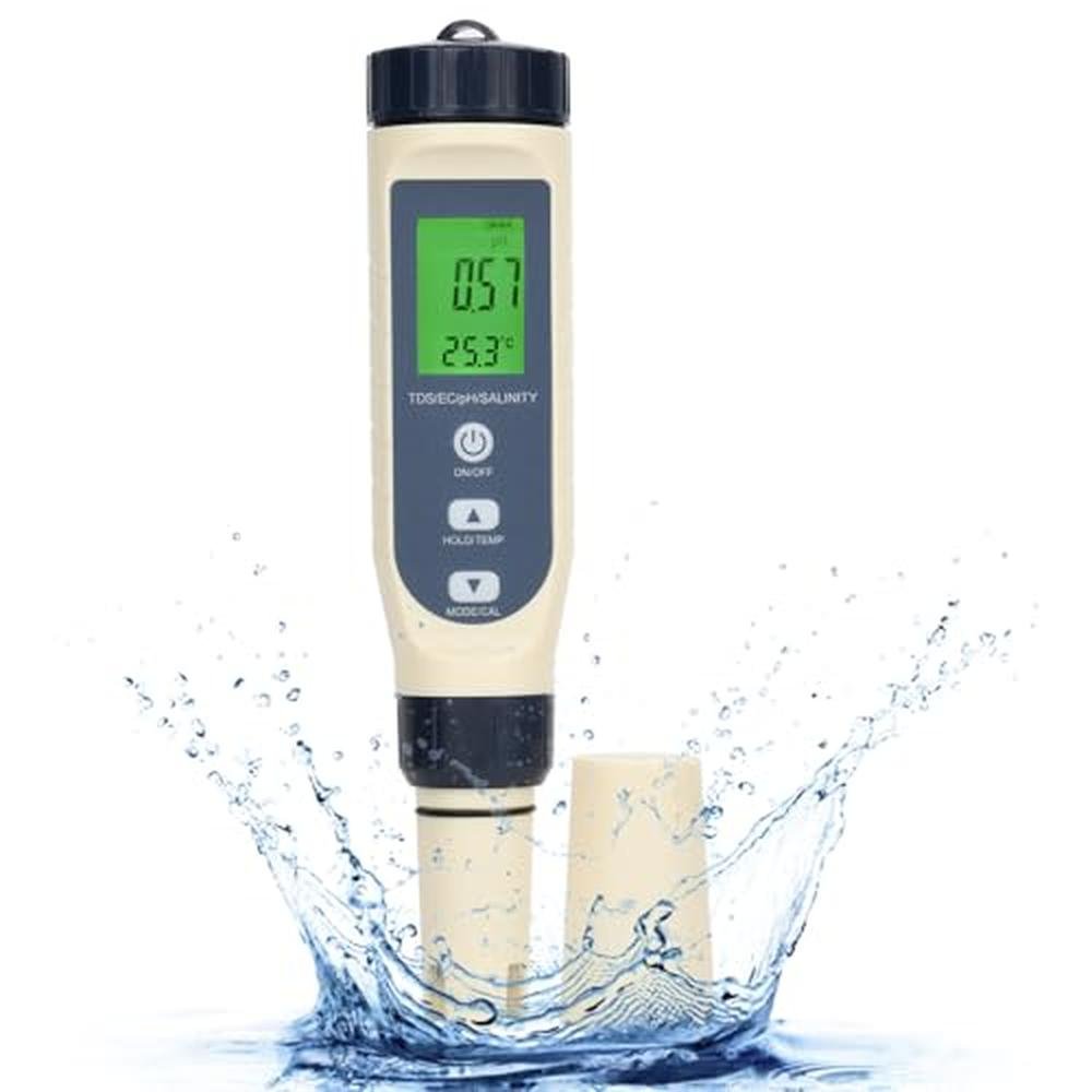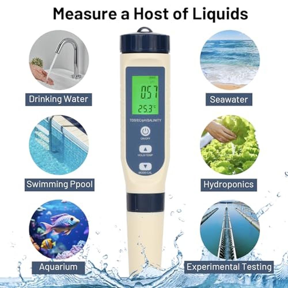 - VERSATILE 5-IN-1:Pool thermometer Measures salinity (0-9999ppm), pH (0.00-14.00), TDS (0-9999ppm), EC (0-9999S/cm), and temperature (32.1-140F) for comprehensive water quality testing
