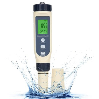 This versatile 5-in-1 digital water quality tester is an essential tool for aquarium enthusiasts and pool owners. The device accurately measures multiple crucial parameters: salinity (0-9999 ppm), pH levels (0.00-14.00), TDS (0-9999 ppm), EC (0-9999 S/cm), and temperature (32.1-140F). The large backlit LCD screen displays clear readings, making it easy to monitor your water conditions. Perfect for testing saltwater aquariums, pools, and even drinking water, this meter provides professional-grade measurements in a compact, handheld design. The salinity testing range accommodates both sea salt (0-10000 PPM) and edible salt (0.01-25%) measurements. The device features simple one-button operation with mode selection and temperature hold functions. Its waterproof design ensures reliable performance in wet environments. This comprehensive testing tool eliminates the need for multiple separate meters, saving both space and money while delivering accurate readings for all your water quality monitoring needs.